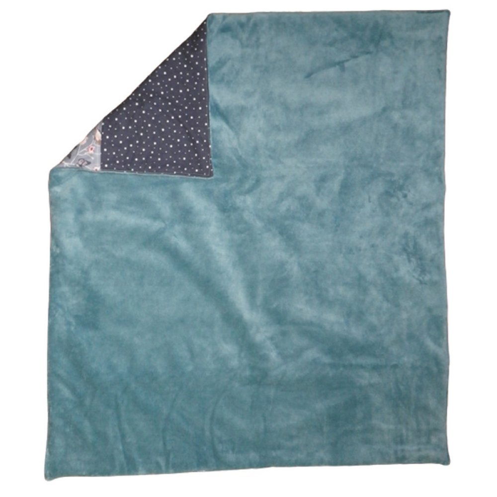 Une face avec différents tissus bleus (4 motifs) / une face avec de la fausse fourrure / douillette bleue