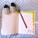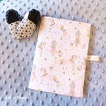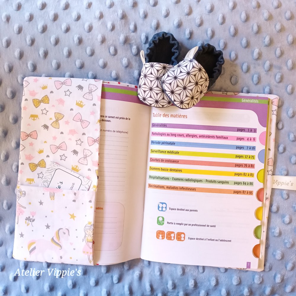 Couvre carnet de santé en tissu coton Lavable en machine, possédant des rabats avec poches ainsi qu'un marque page.