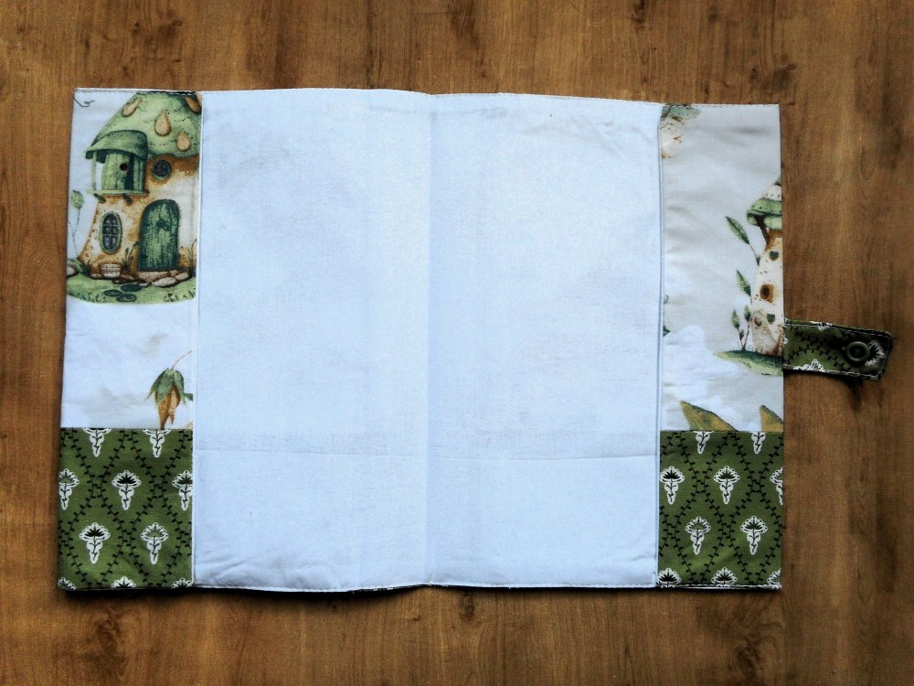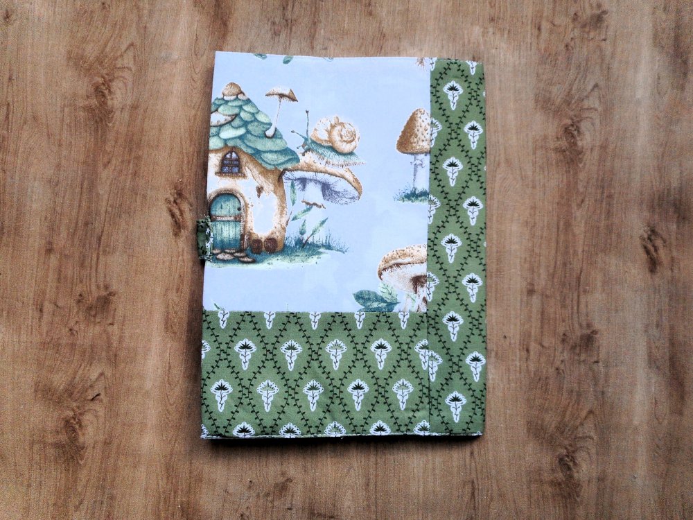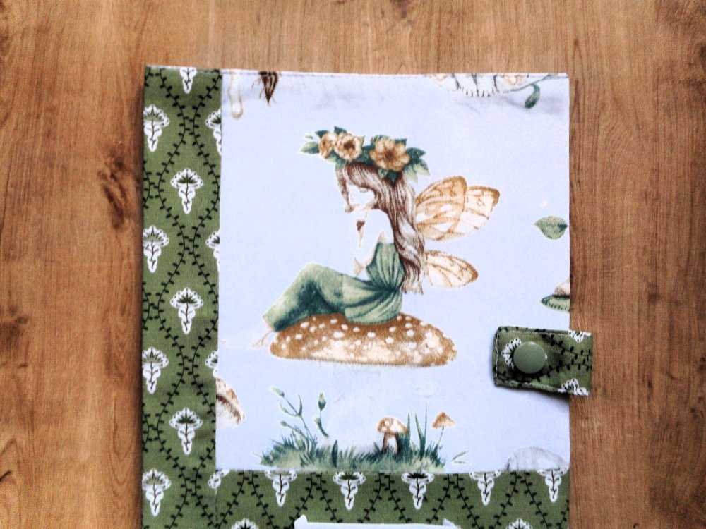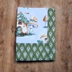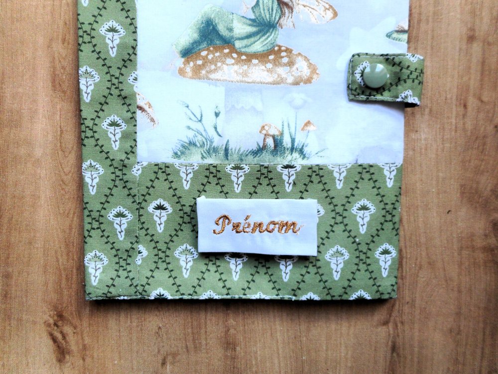 Housse en coton blanc imprimé d'une fée assise sur un champignon pour le devant, dans le dos c'est une maison avec un escargot et des champignons, la tranche et les parties inférieures sont imprimées de brins d'herbes stylisés