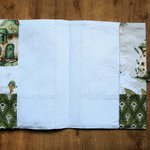 La doublure et l'étiquette sont en coton blanc, le rabat est en coton "herbes".