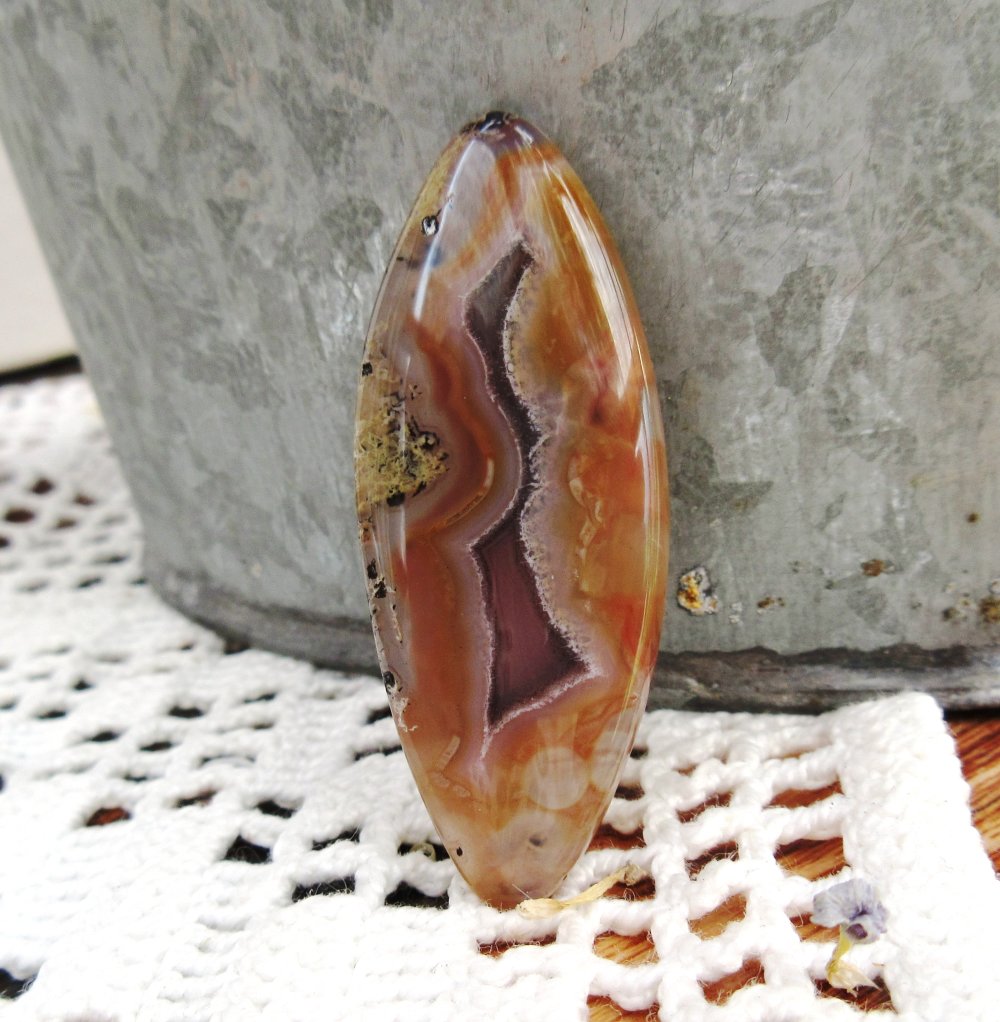 Ce magnifique cabochon d’agate agua nueva a été coupé et poli à la main pour mettre en valeur les bandes de fortification étonnantes en rose et orange et mousse verte .