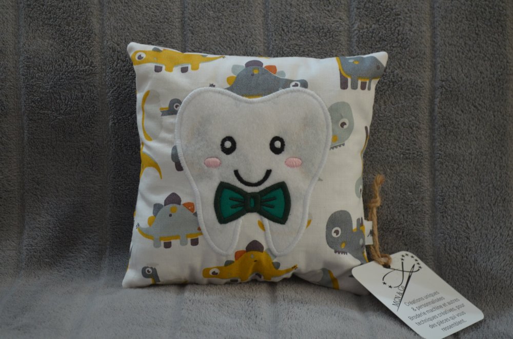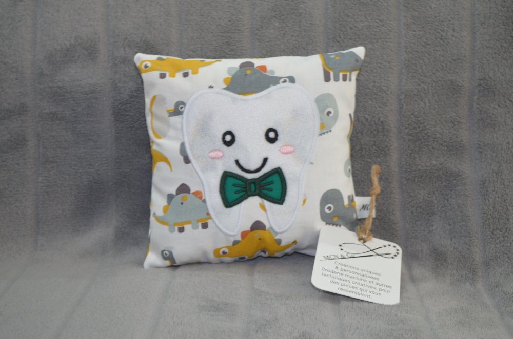 Sur le coussin, une adorable dent est brodée avec un nœud papillon vert.