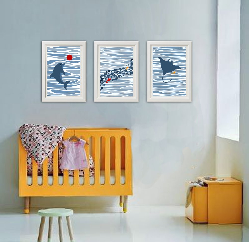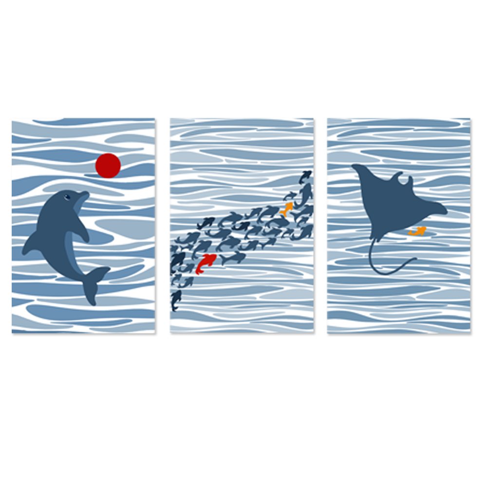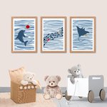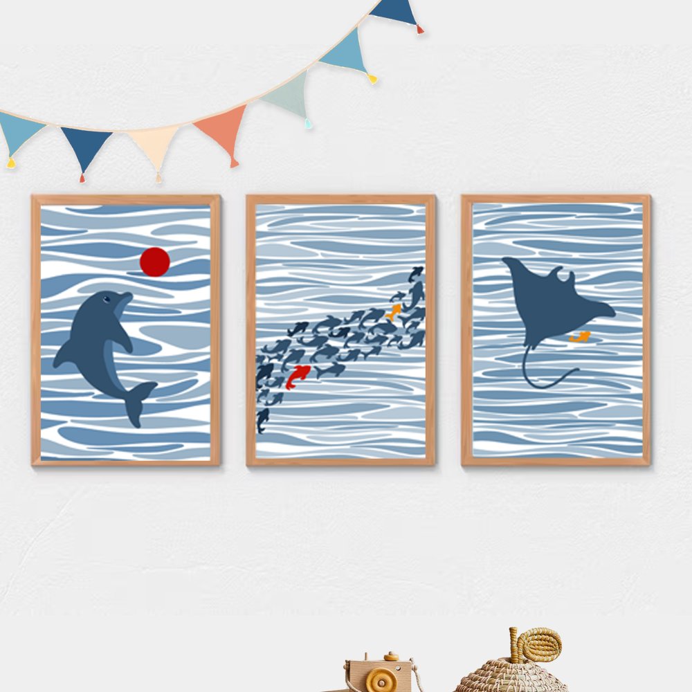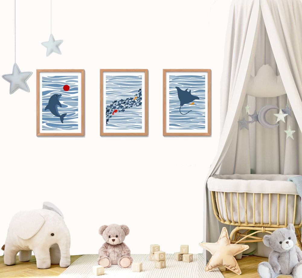 Ce lot de 3 affiches murales illustre l'univers de l’océan avec un dauphin joueur, des poissons colorés et une raie gracieuse. Dans une harmonie de bleus doux, ces posters créent un cocon rassurant et éveillent l’imaginaire de l’enfant.