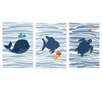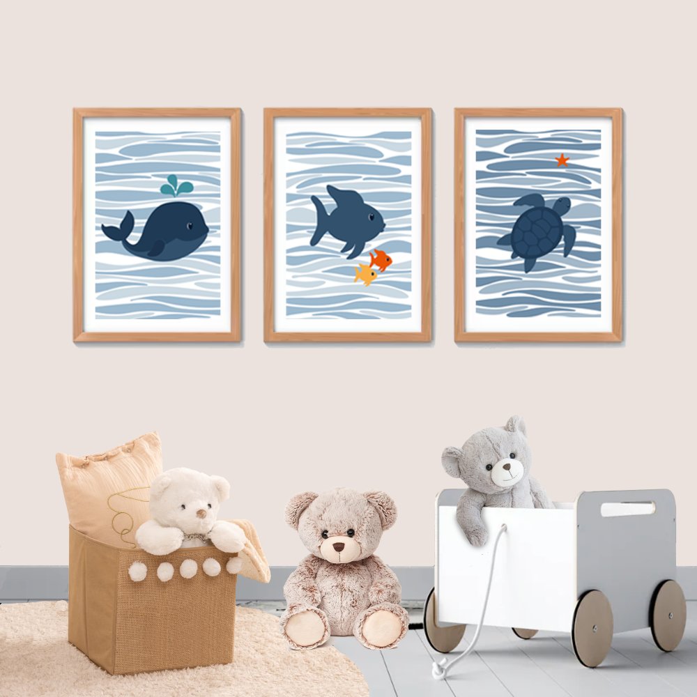 Lot de 3 affiches aux couleurs douces sur le thème de l'océan avec poisson, tortue et baleine.