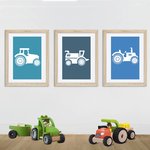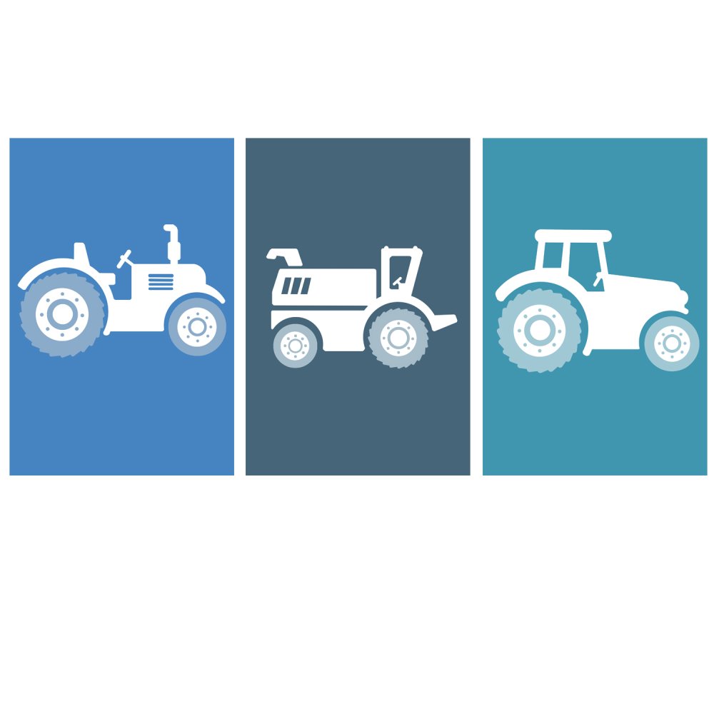 3 affiches sur le thème de la ferme avec tracteurs sur fonds unis bleus. Tracteurs et engins de la ferme qui plairont aux petits garçons tout en proposant une décoration actuelle et douce.
