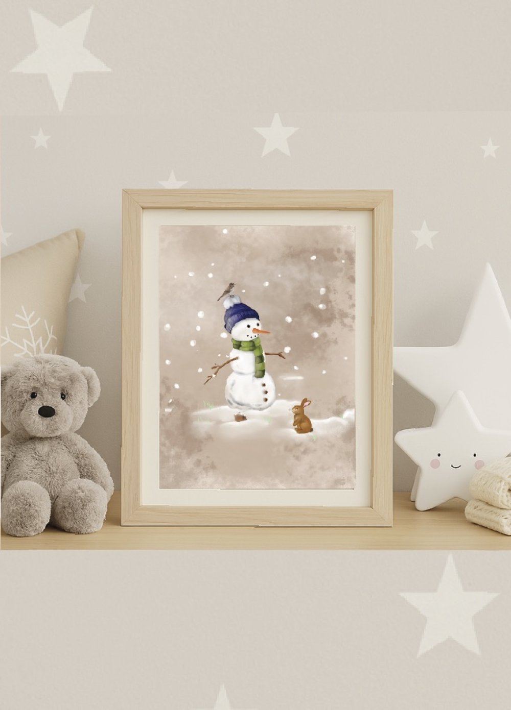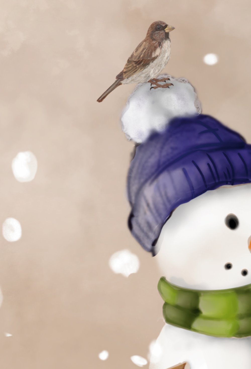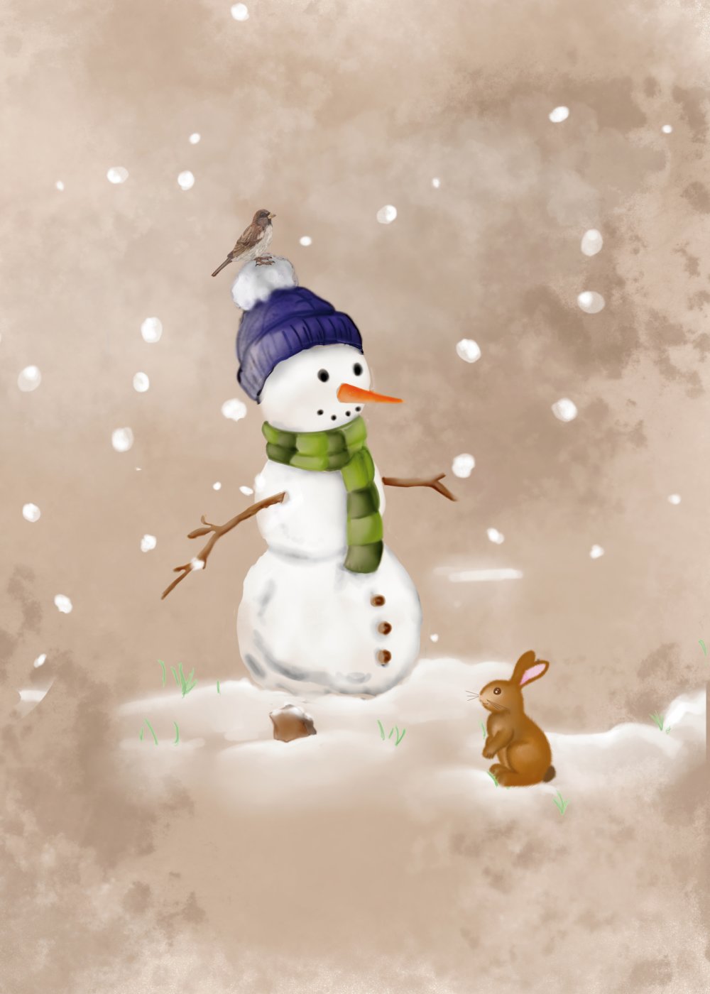 On y découvre un bonhomme de neige souriant, son bonnet en laine, une petite visite du lapin curieux et un oiseau perché, comme une scène sortie d'un conte hivernal.