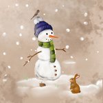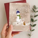 Une carte de Noël tendre et poétique représentant un bonhomme de neige, un petit lapin curieux et un oiseau perché. Illustration douce, parfaite pour vos mots chaleureux de fin d'année.