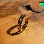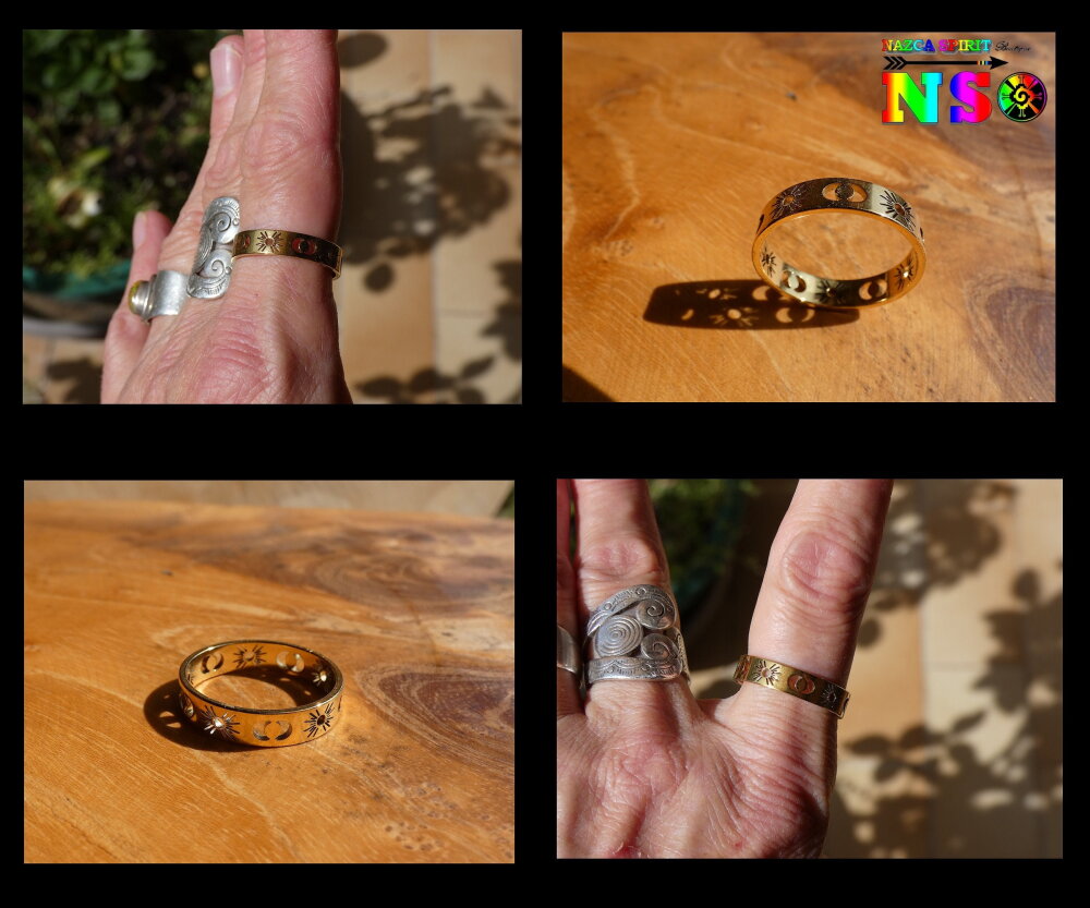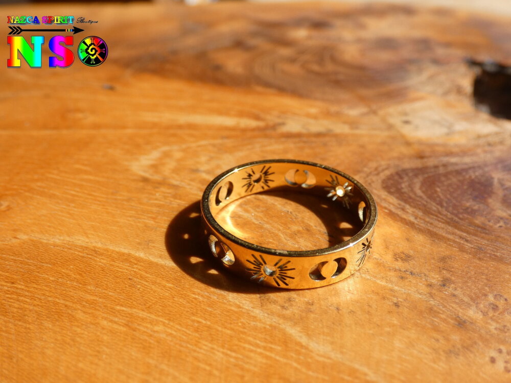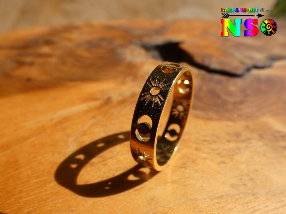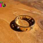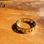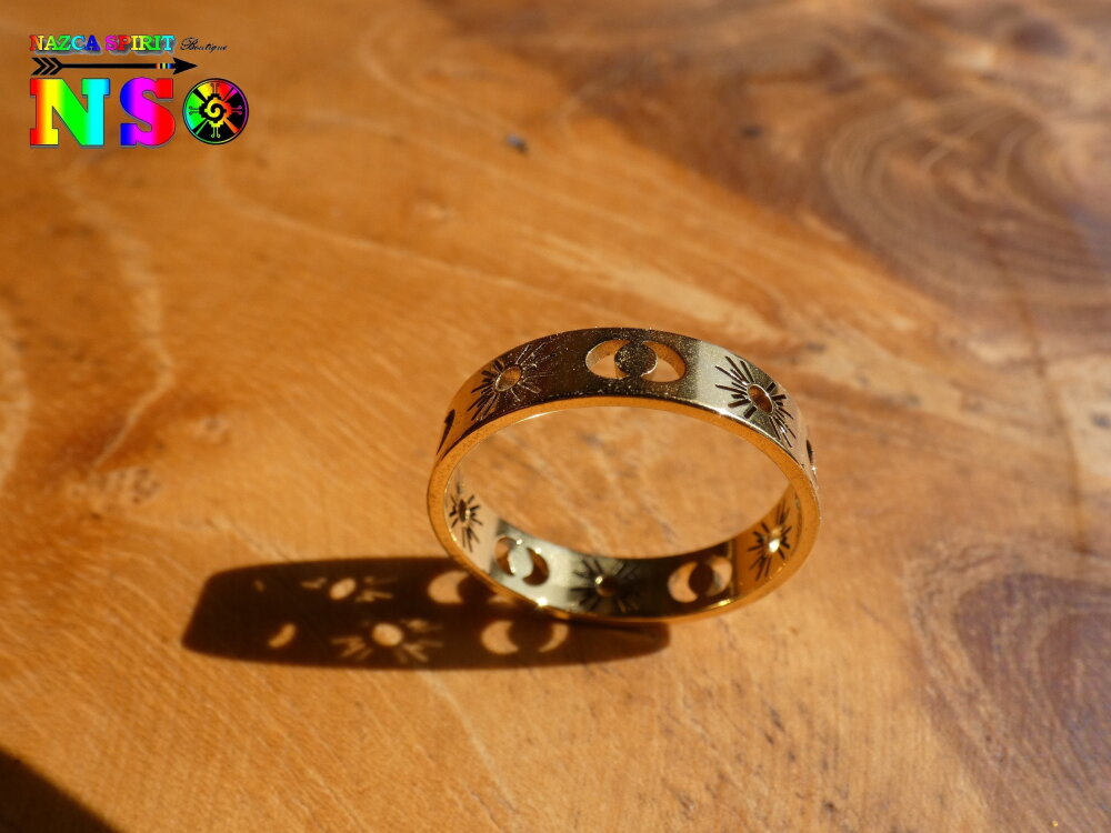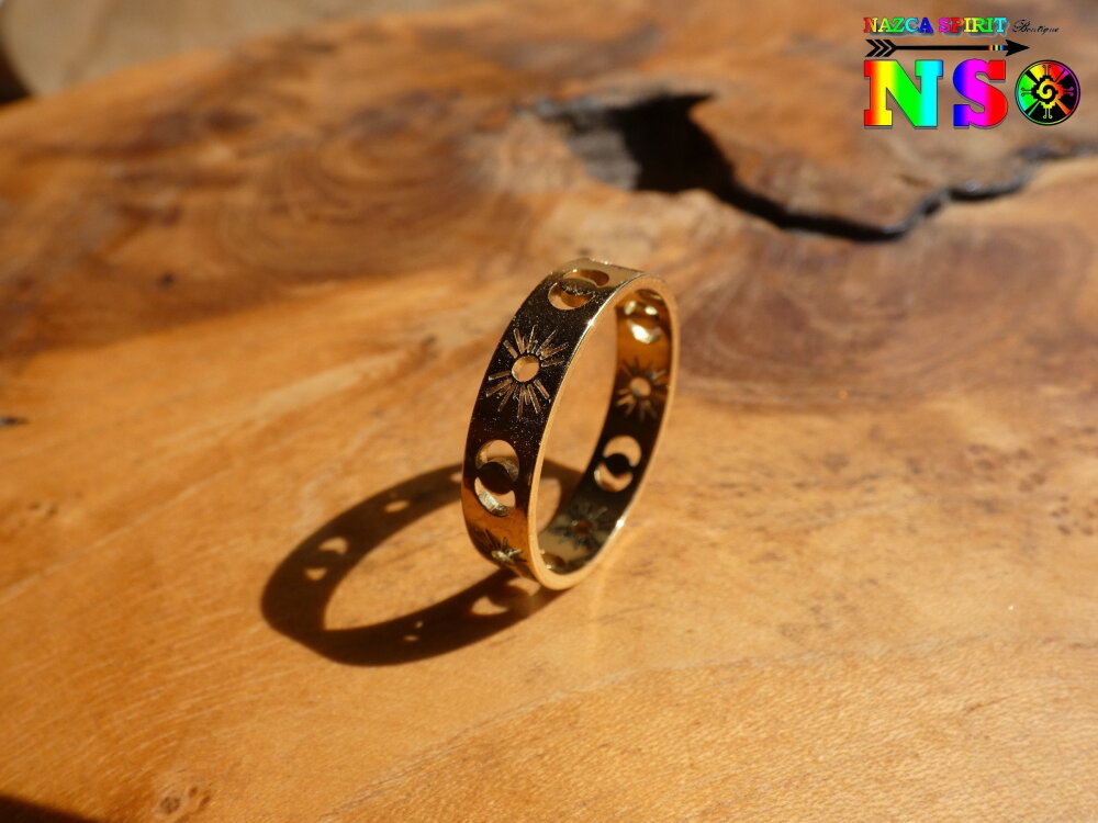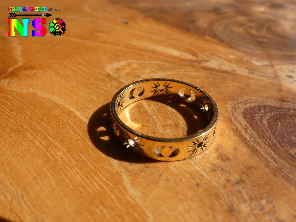 Je vous propose de découvrir une superbe bague anneau alliance non réglage boho bohème en acier inoxydable plaqué or 18K. Un bijou de toute beauté entièrement ciselé d'astres célestes : croissants de lune et soleils.