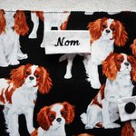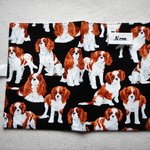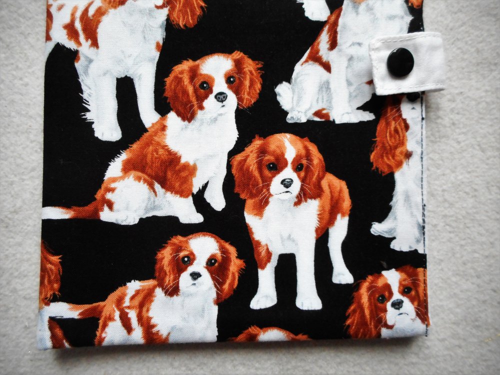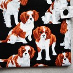 La doublure, le rabat et l'étiquette du nom sont en coton blanc. L'extérieur est en coton imprimé de cavaliers King Charles blanc et roux (Blenheim) dans différentes positions sur fond noir.