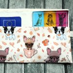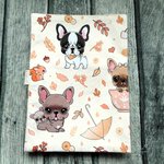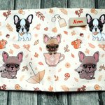 La housse est en coton écru imprimé de bouledogues français noir et blanc, marrons et fauves avec des feuilles d'automne, des sachet de thé, des écureuils, des parapluies, certains sont dans des tasses.