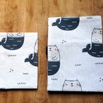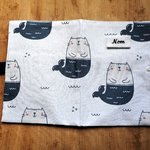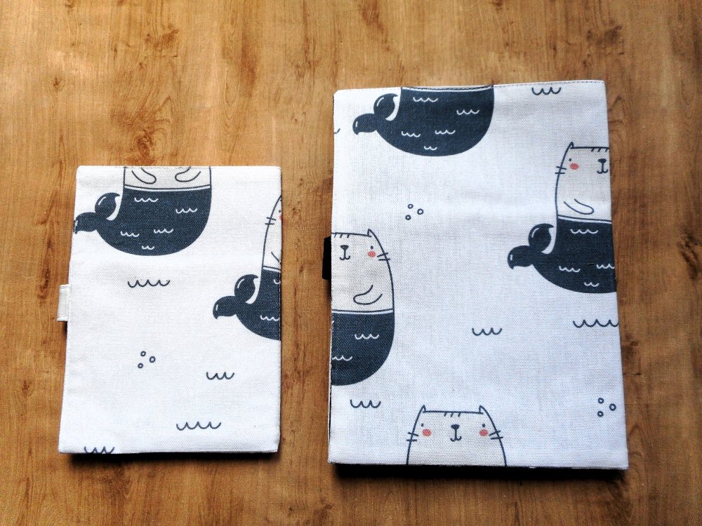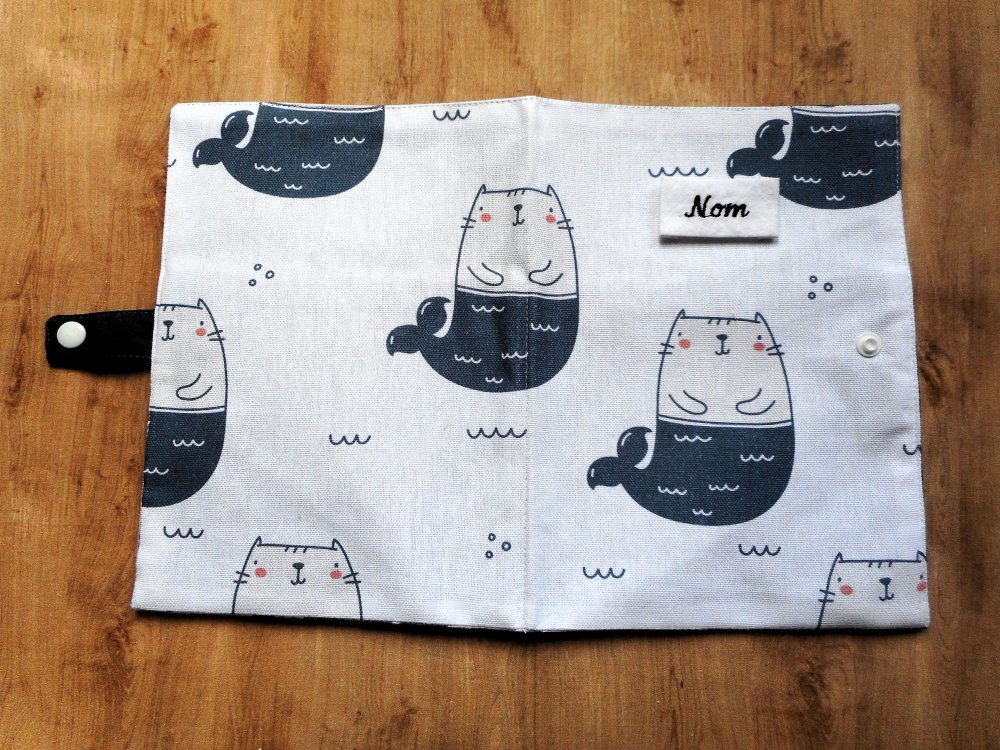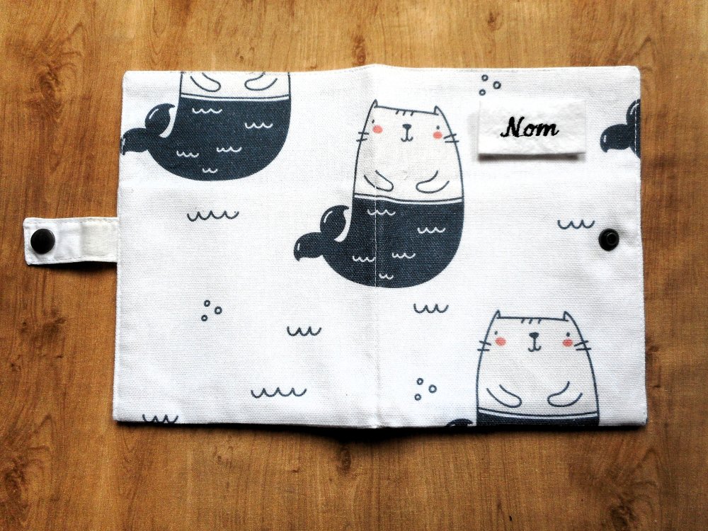 Le tissu extérieur est rigidifié par un renfort. Il est en coton canevas imprimé de chats avec la queue en sirène, baleine ou poisson, selon votre imaginaire, sur fond blanc avec des vagues.