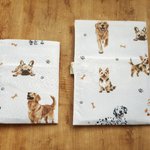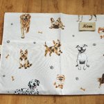 La housse est en coton écru imprimé de chiens heureux (dalmatien yorkshire, spitz, american staff, épagneul, labrador, bouledogue français, shiba inu, etc...) avec des os et des empreintes de pattes.