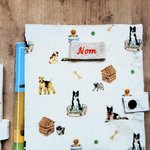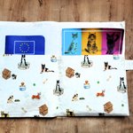 La couverture est en coton écru imprimé de chiens (border collie, berger allemand, carlin, corgis, caniche, welsh terrier, etc...) avec des paniers, des niches, des os et des jouets.