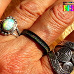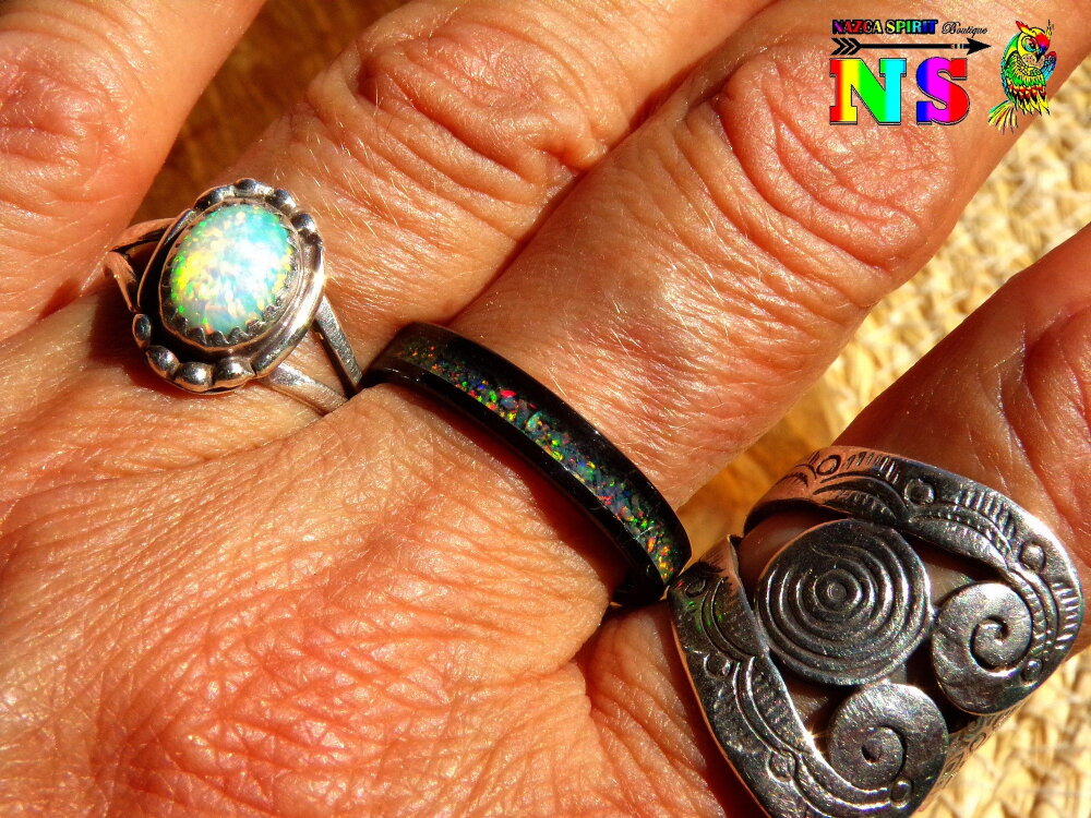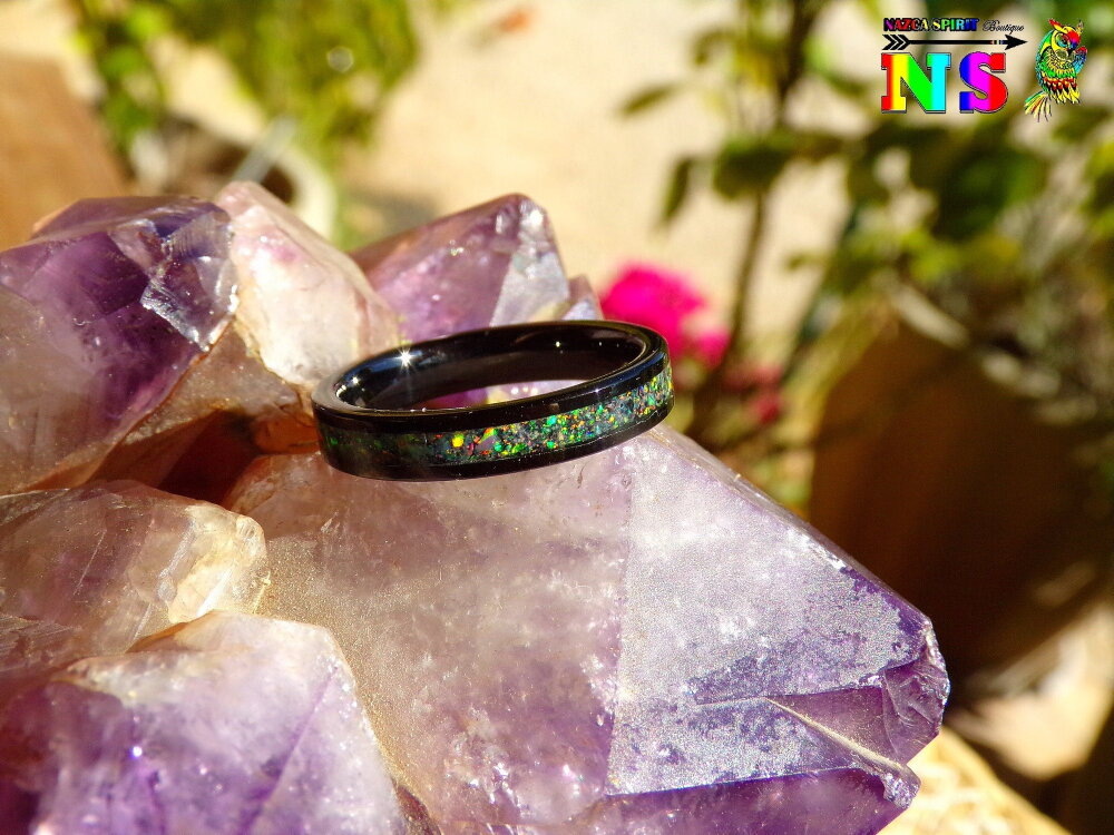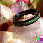 Je vous présente un anneau (alliance) absolument magnifique réalisée en carbure de tungstène et opales de feu du Mexique. La bague est ultra lumineuse !