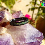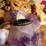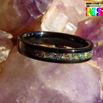 Le carbure de tungstène noir utilisé pour la réalisation de cette alliance met superbement en valeur les morceaux d'opales incrustés à l'aide de résine cristal tout autour de l'anneau.