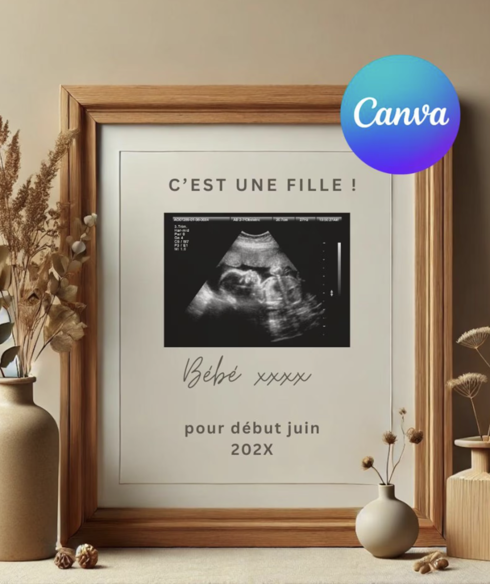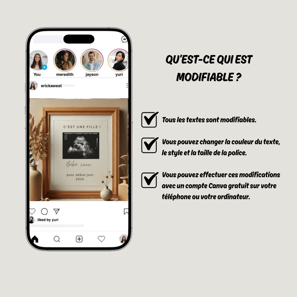 Ce fichier permet de créer une annonce de grossesse douce, élégante et 100% modifiable, idéale pour partager la belle nouvelle avec vos proches ou pour garder un souvenir précieux.