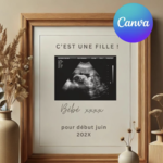Ajoutez simplement le prénom du futur bébé et la date prévue d’arrivée, puis téléchargez votre création en quelques clics.