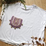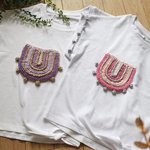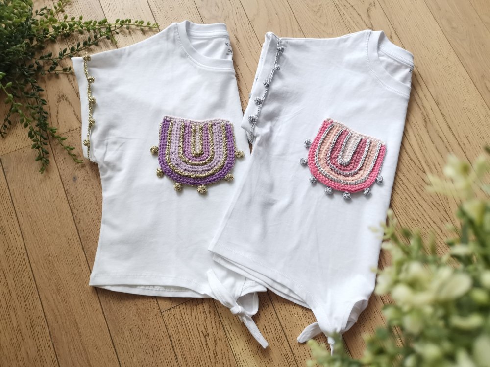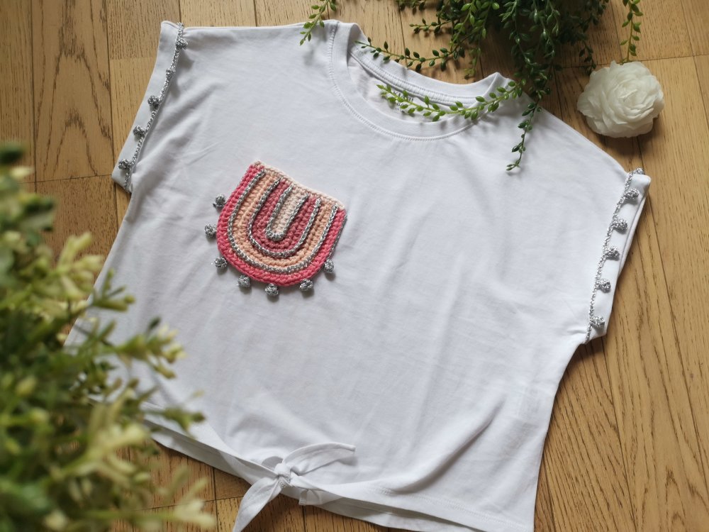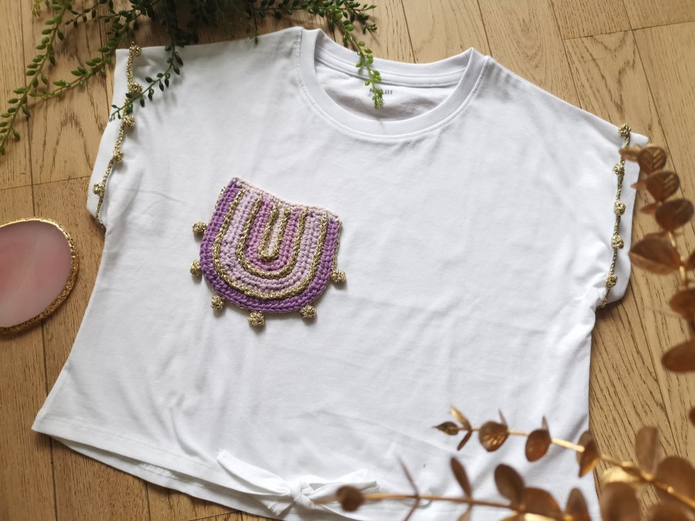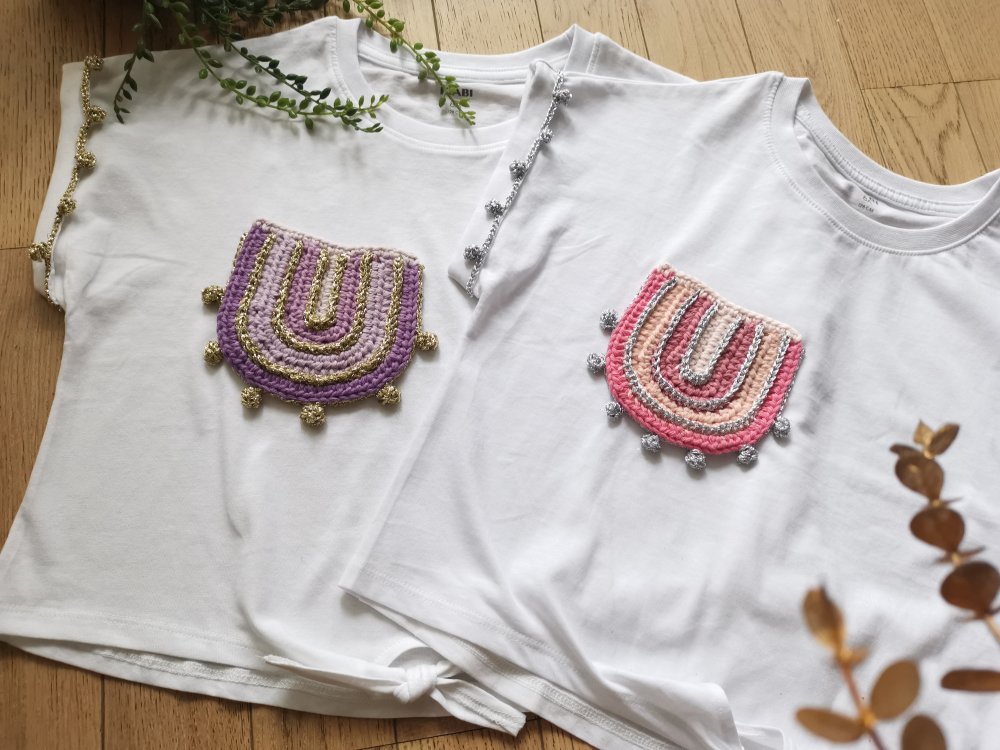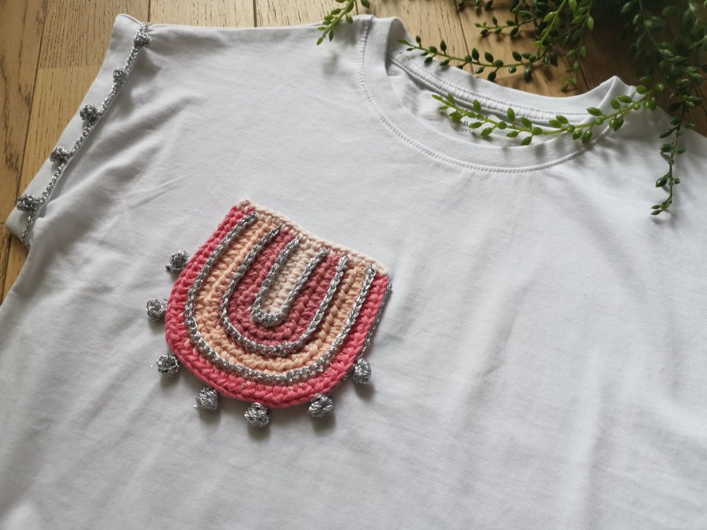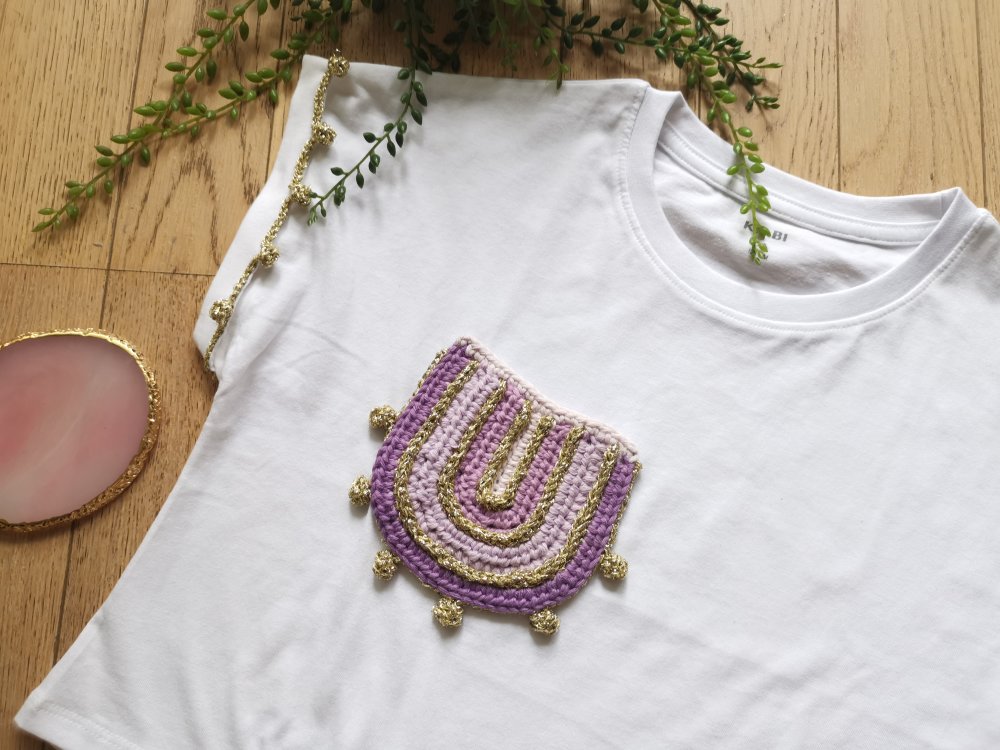 Un petit concentré de douceur pour personnaliser vos vêtements : cette applique crochetée en forme d’arc-en-ciel joue avec un dégradé de couleurs (dans les tons roses ou violets au choix), souligné par un contour argenté ou or délicat.