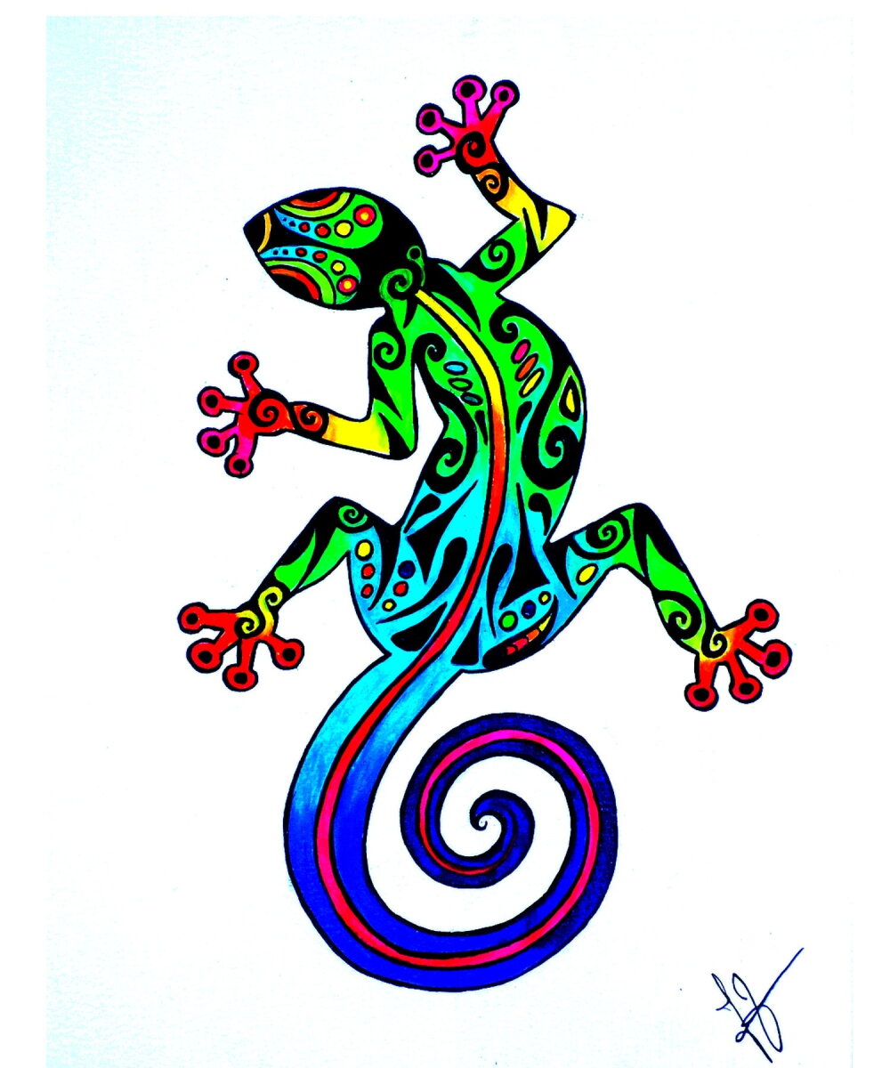 Aquarelle Revisitée Gecko Maori Version Tatoo Multicolore sur Papier Aquarelle Format A3 -300 g