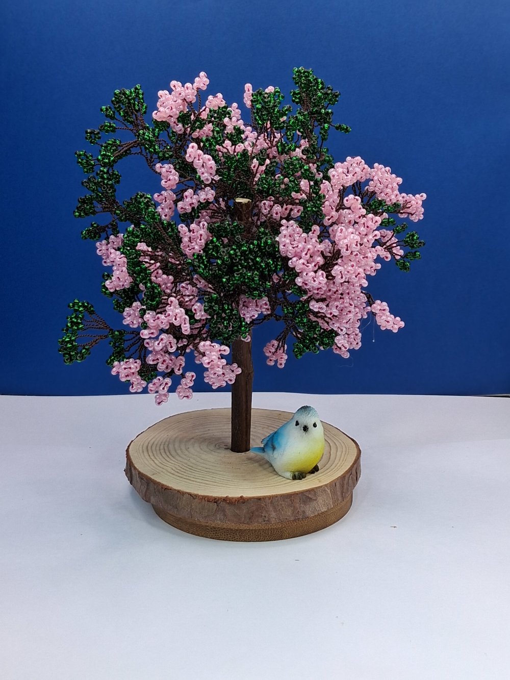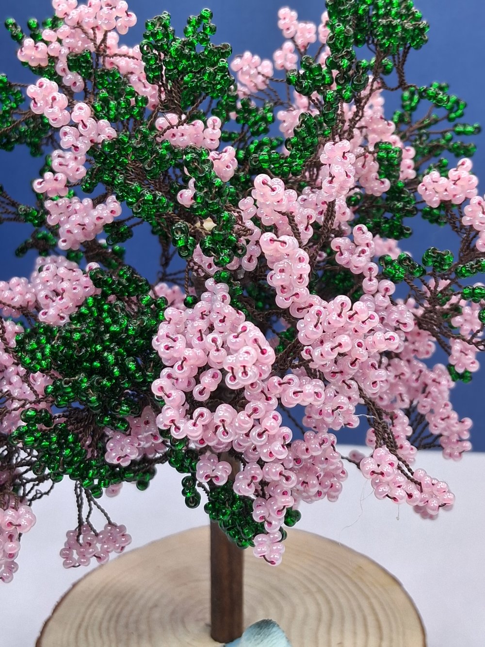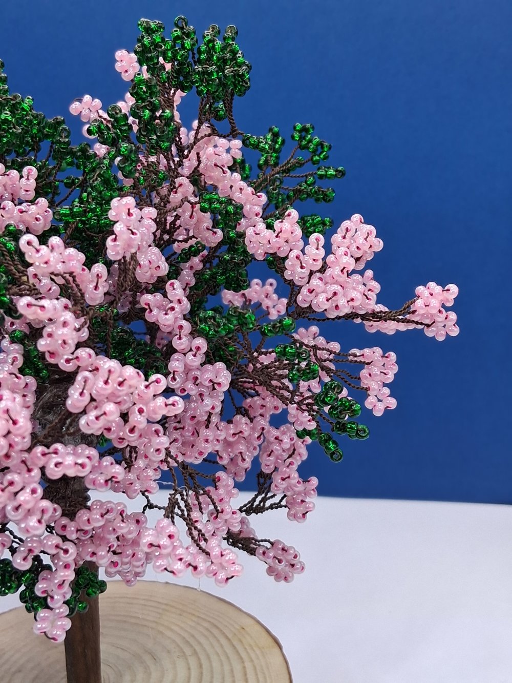 Entièrement réalisé à la main, cet arbre décoratif est confectionné avec soin à l’aide de perles de rocailles roses et vertes, enroulées sur du fil de cuivre fin.
