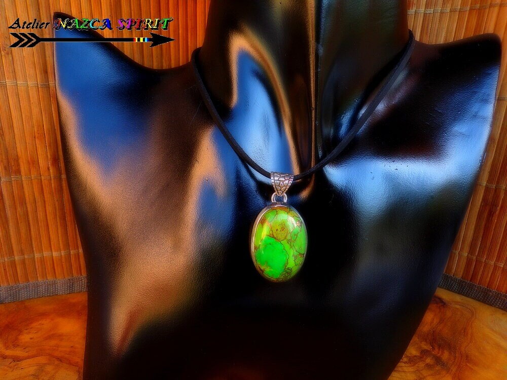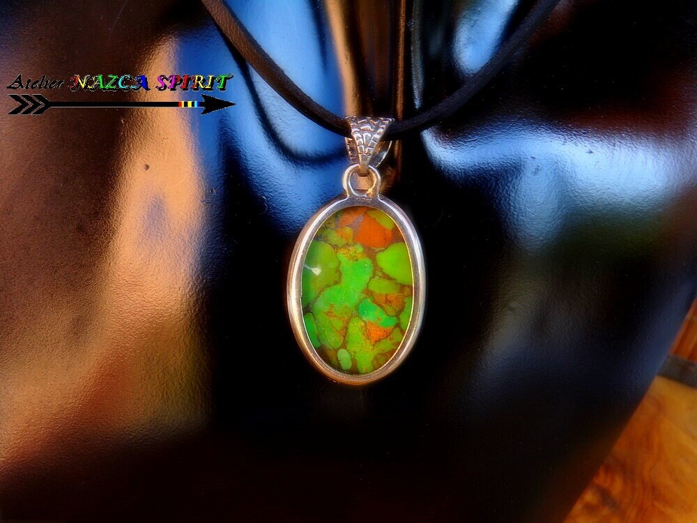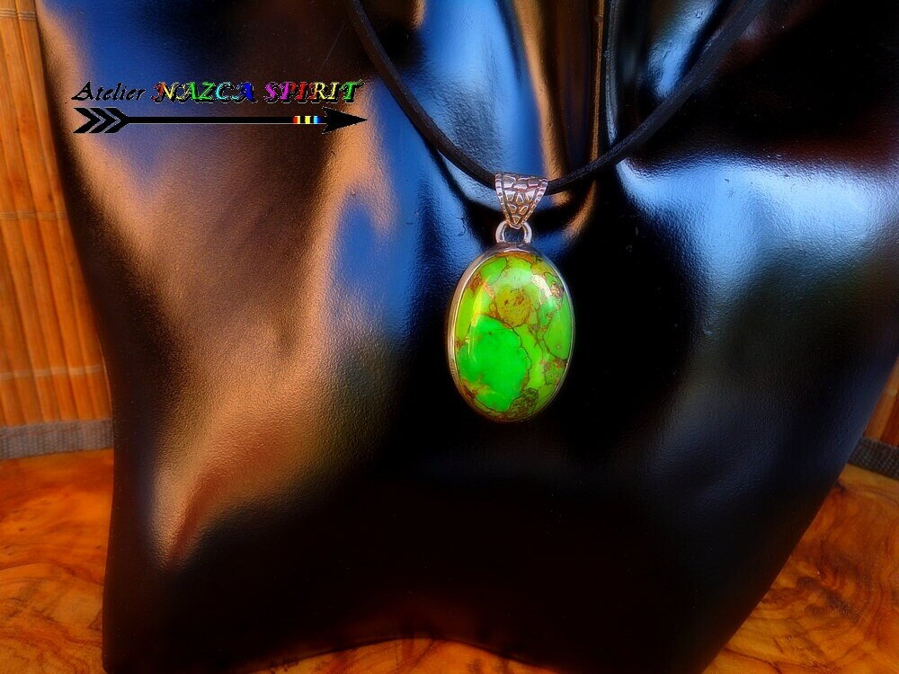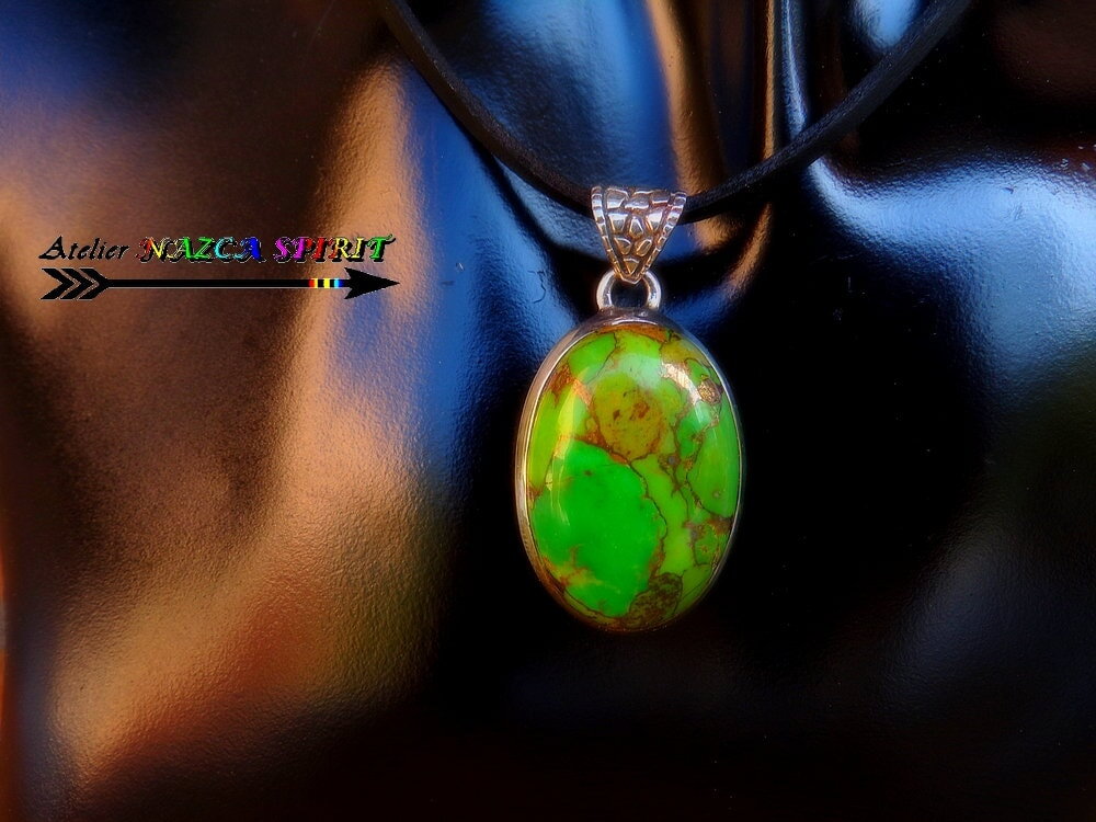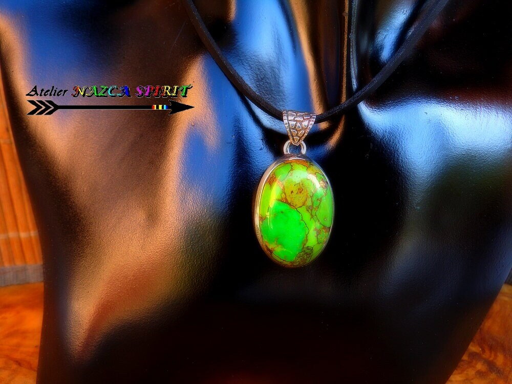 Collier Amérindien Réglable / Pendentif Argent 925 / Turquoise Mohave Verte / Pierre Fine Ovale / Esprit Native American.
