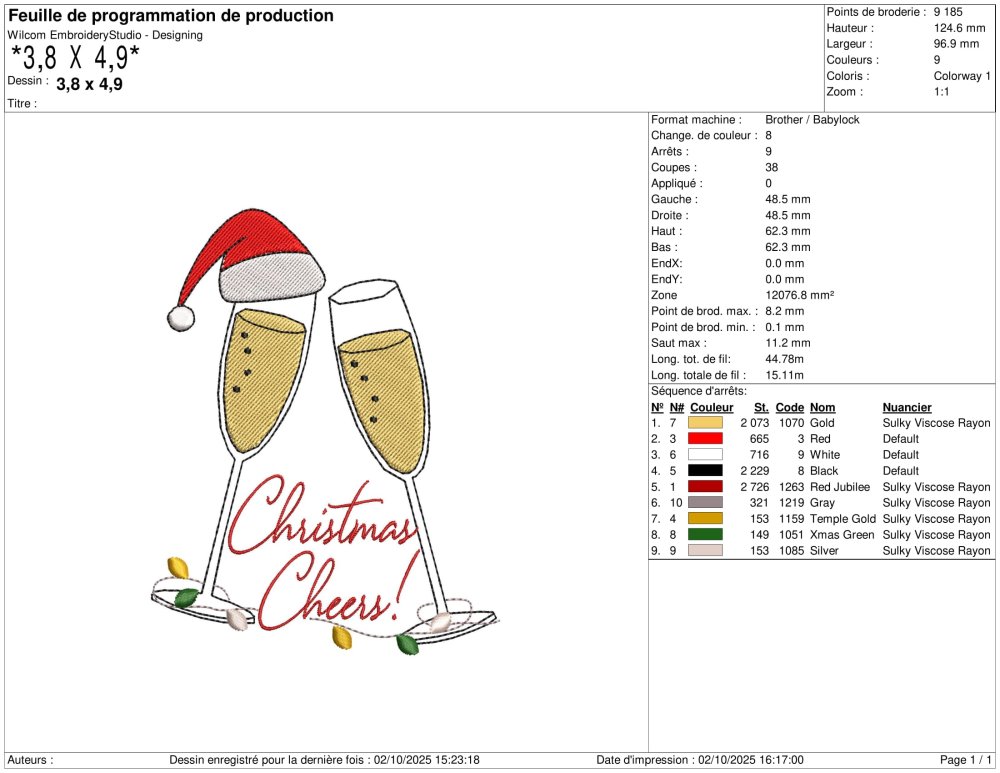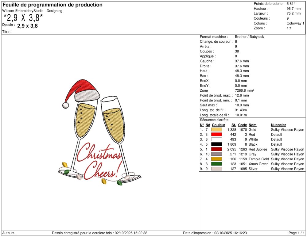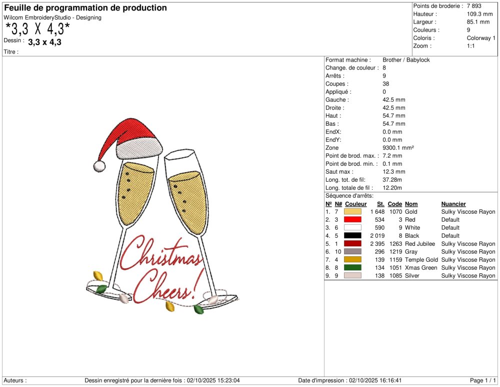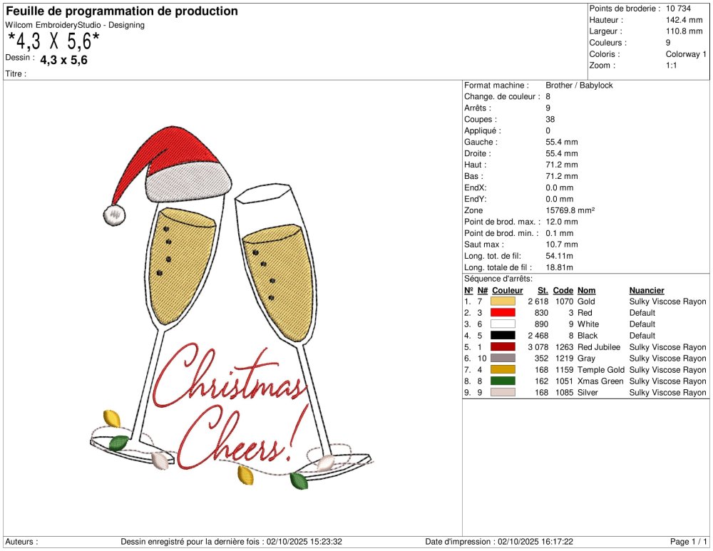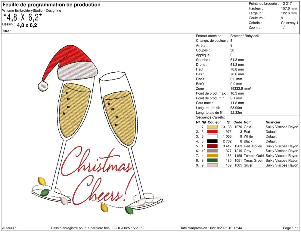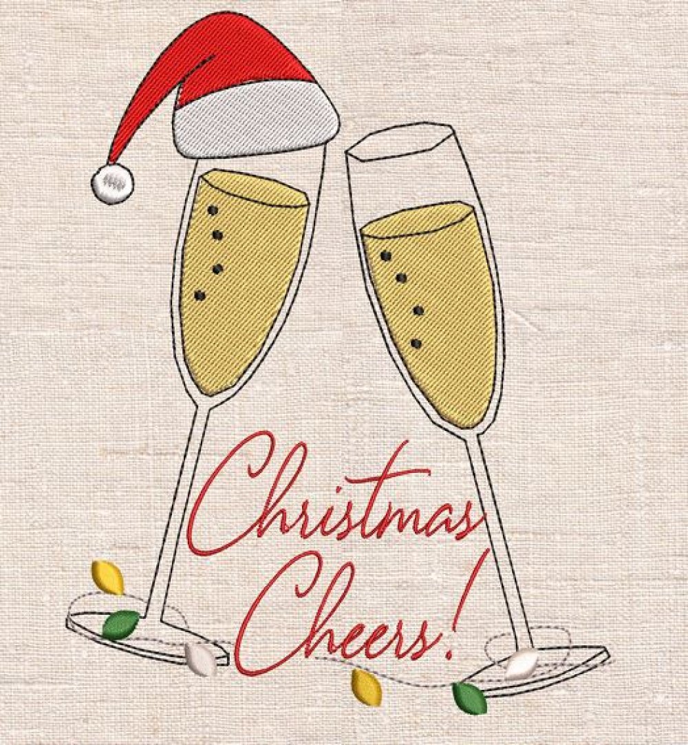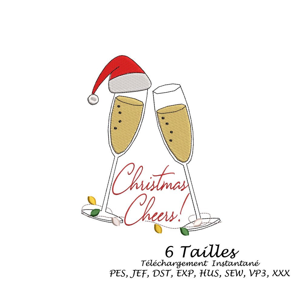 Motif 2 coupes de champagne avec bonnet de Noël et Christmas Cheers pour Machine à Broder disponible en 6 Tailles et Multi Formats.