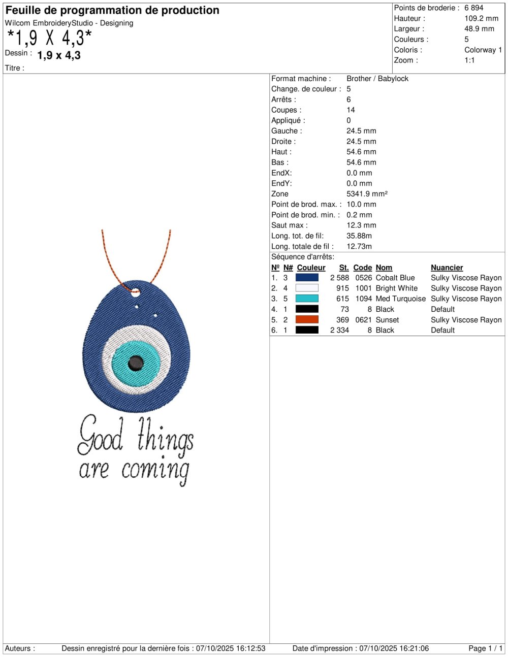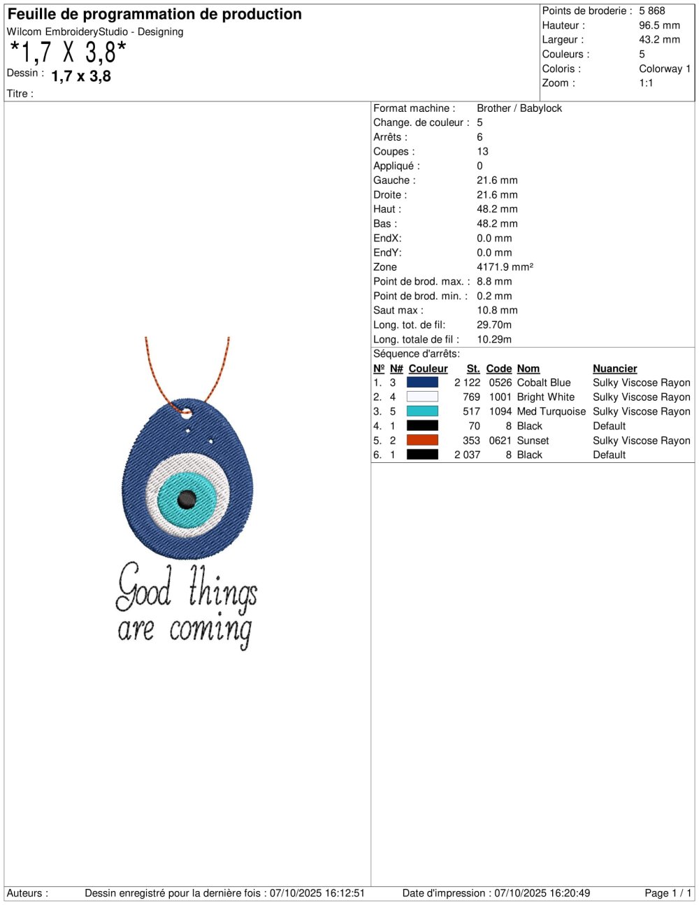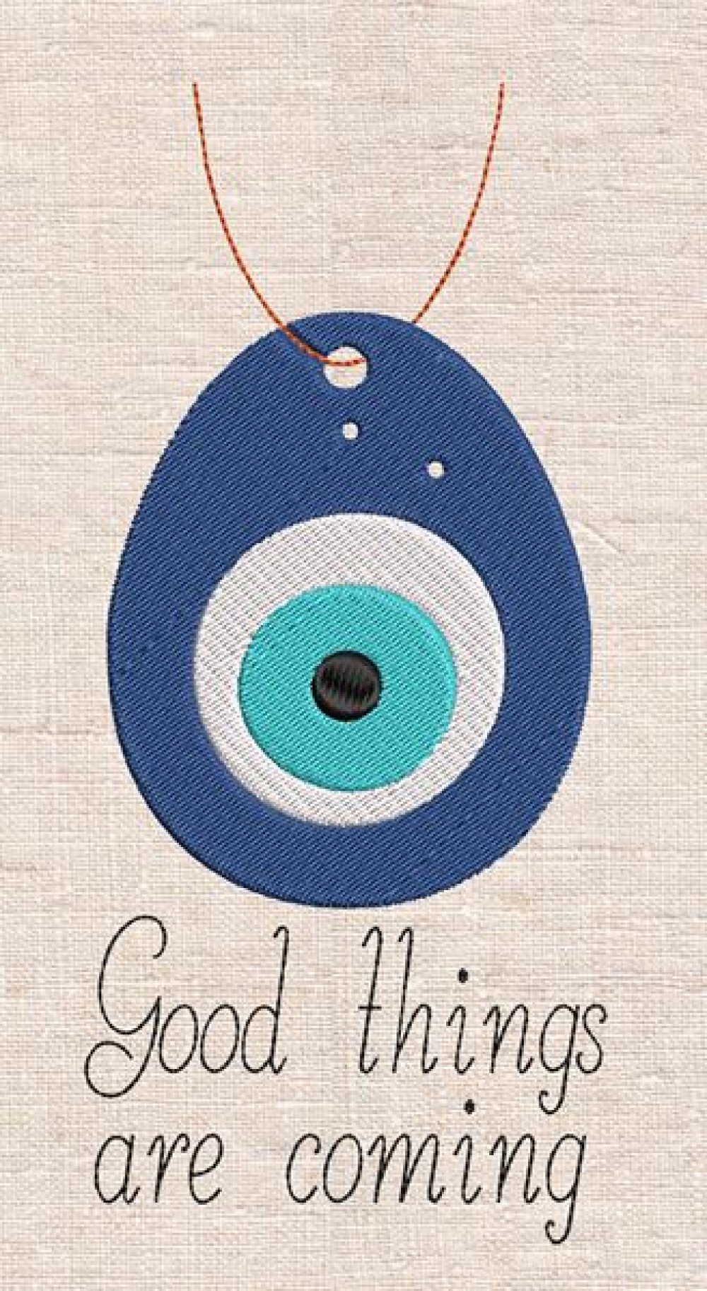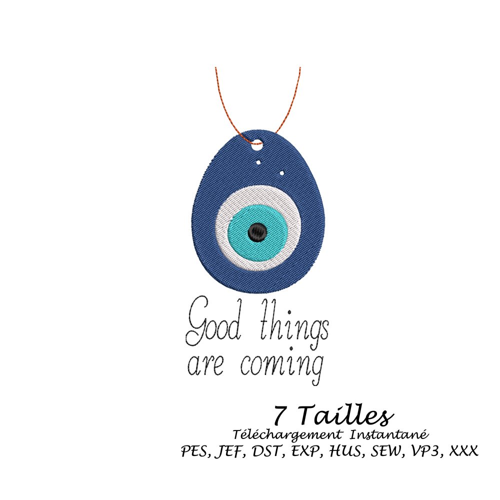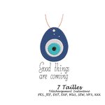 Motif troisième Oeil en pendentif avec citation ( les bonnes choses arrivent) pour Machine à Broder disponible en 7 Tailles et Multi Formats.