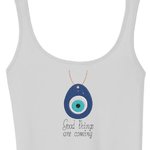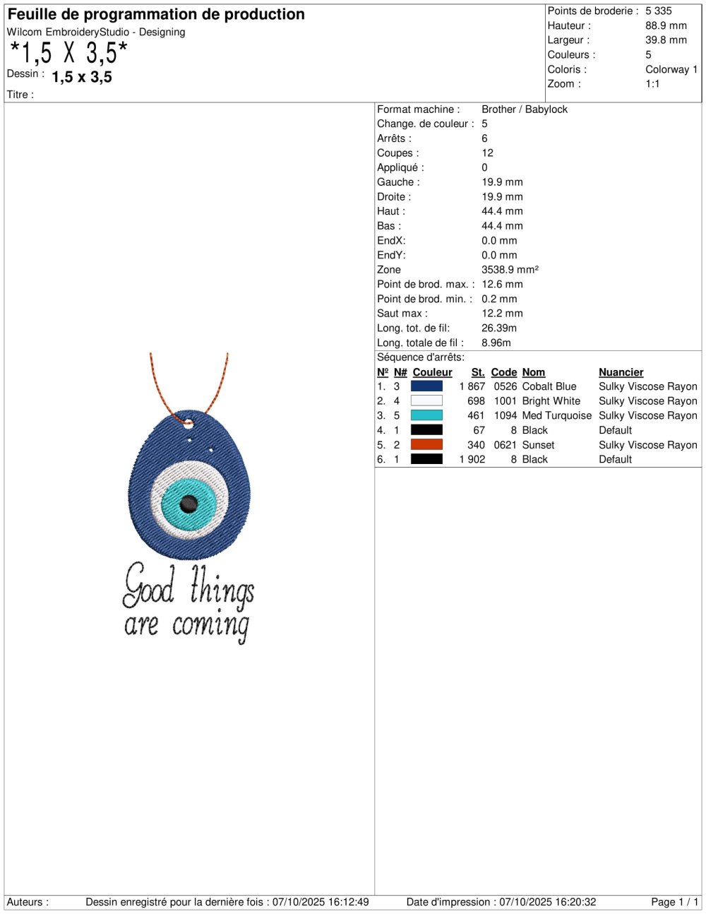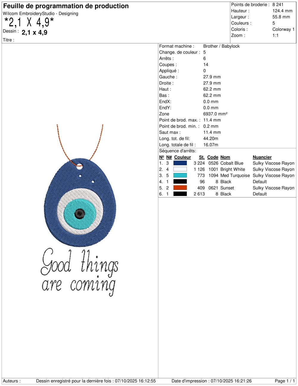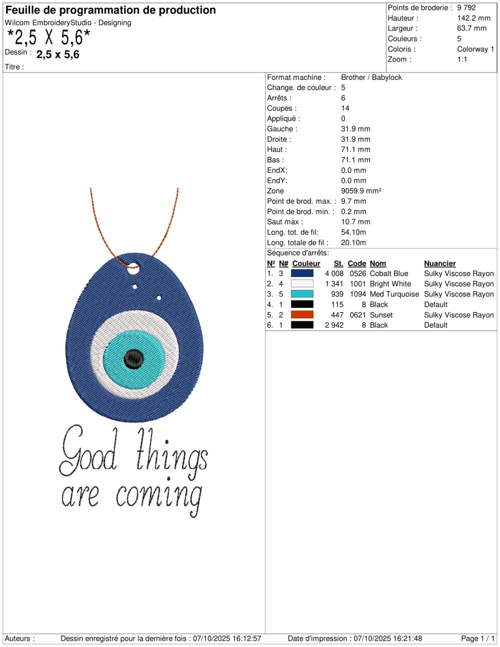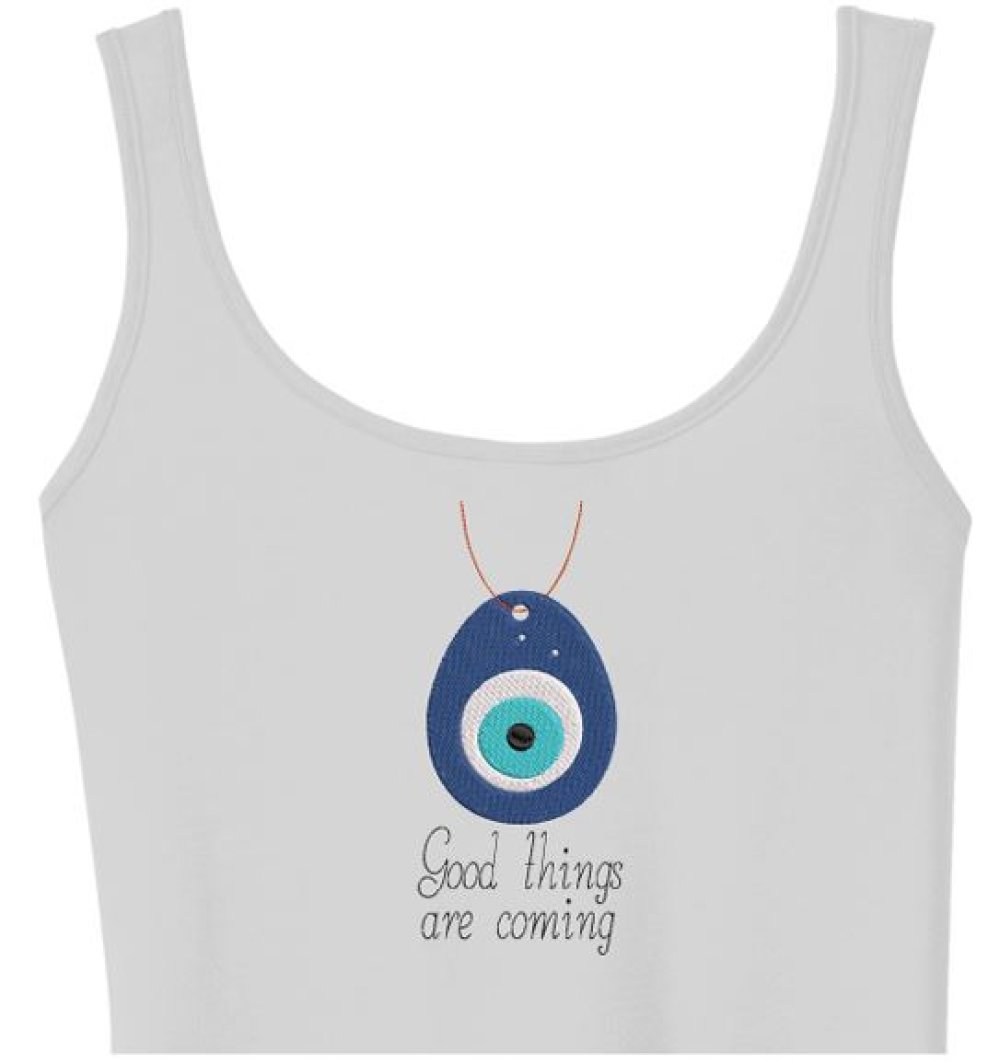 Motif troisième Oeil en pendentif avec citation ( les bonnes choses arrivent) pour Machine à Broder disponible en 7 Tailles et Multi Formats.