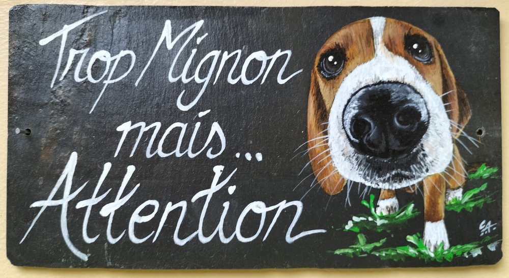 Plaque de maison ou de portail en ardoise, avec une peinture animalière à la peinture acrylique et un phrase humoristique pleine d'originalité.