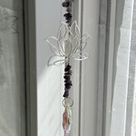 Superbe attrape-soleil composé d’un lotus argenté finement découpé, accompagné de véritables éclats d’améthyste et d’un grand cristal facetté irisé qui diffuse de magnifiques reflets arc-en-ciel dès que la lumière le touche.