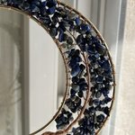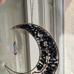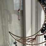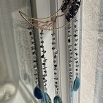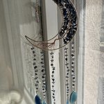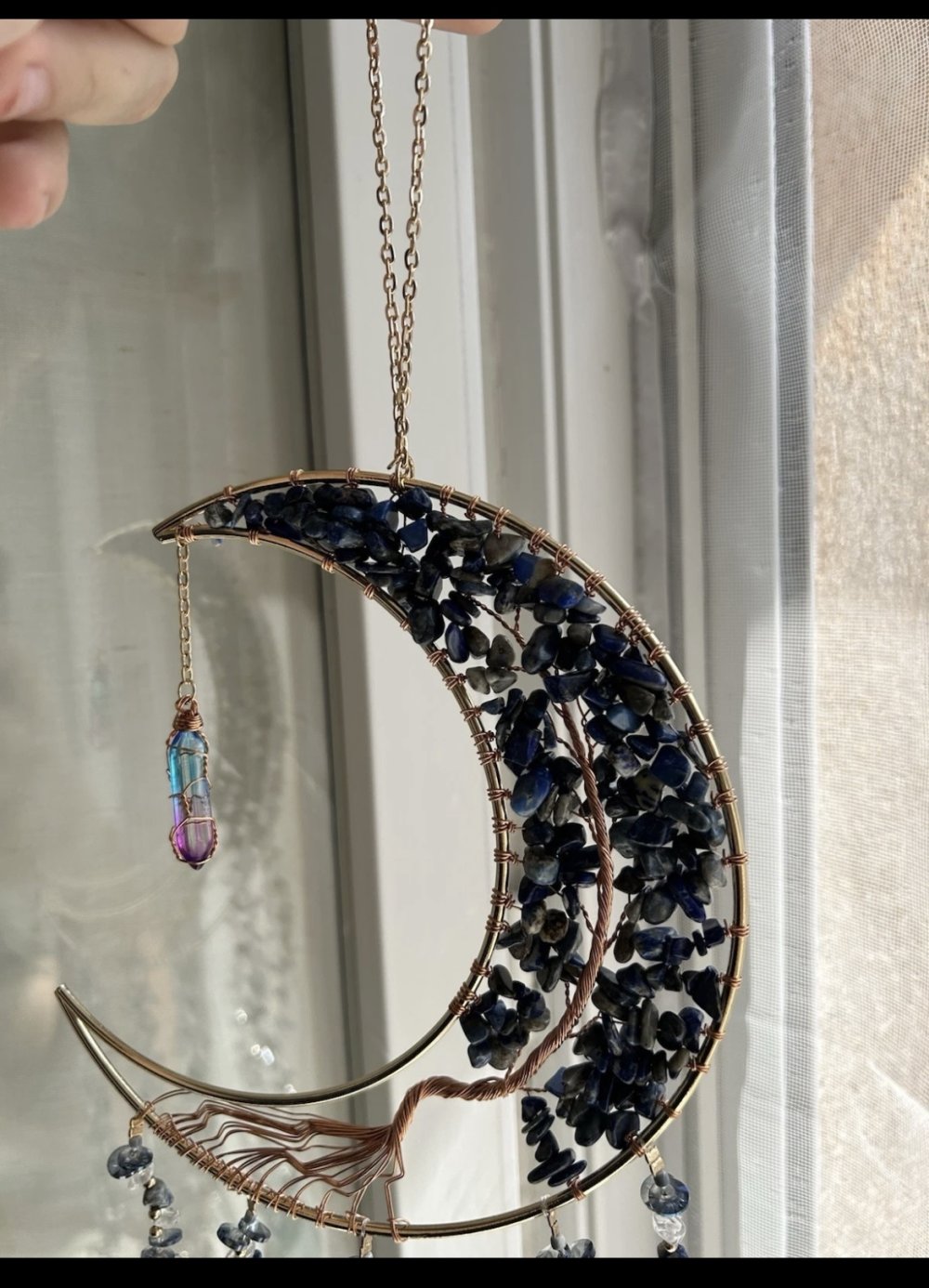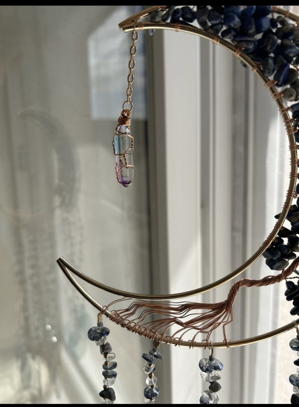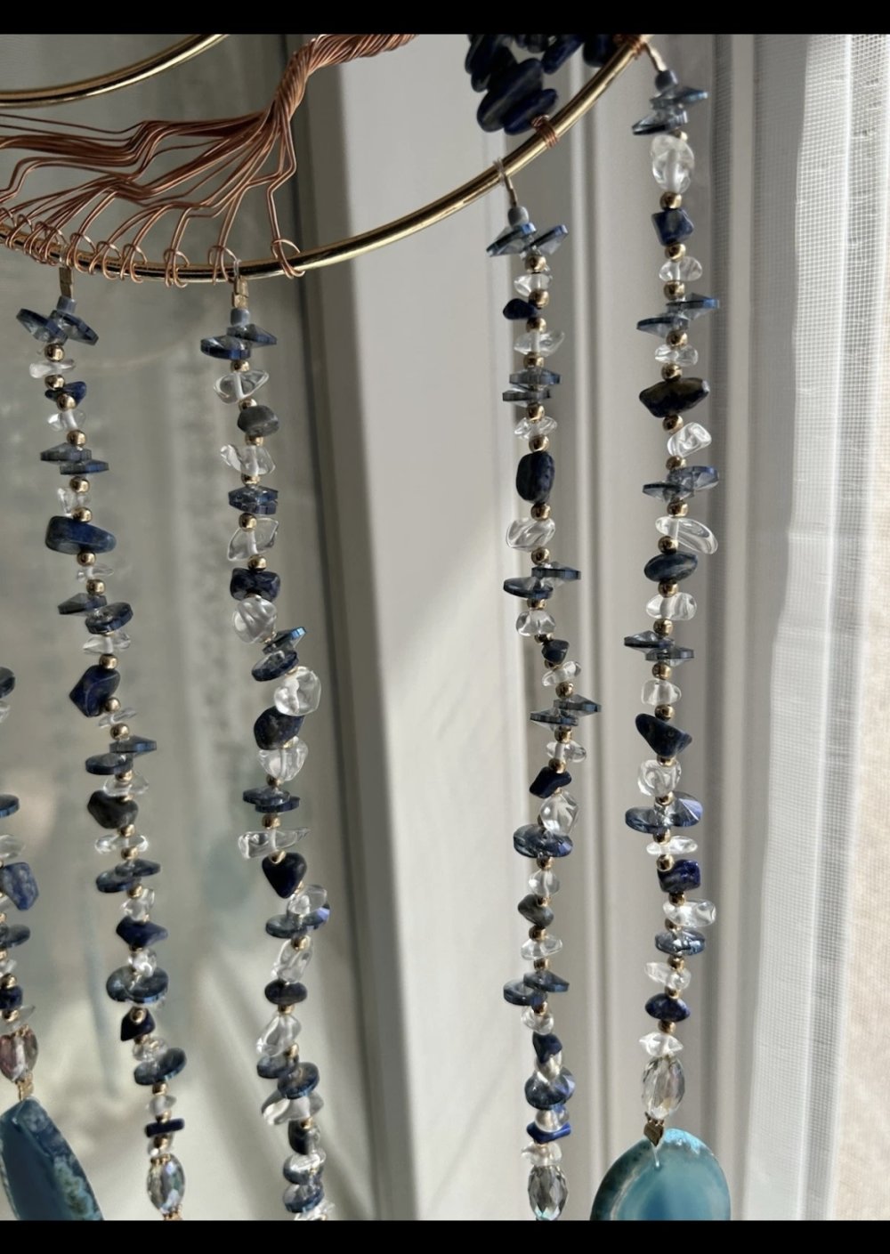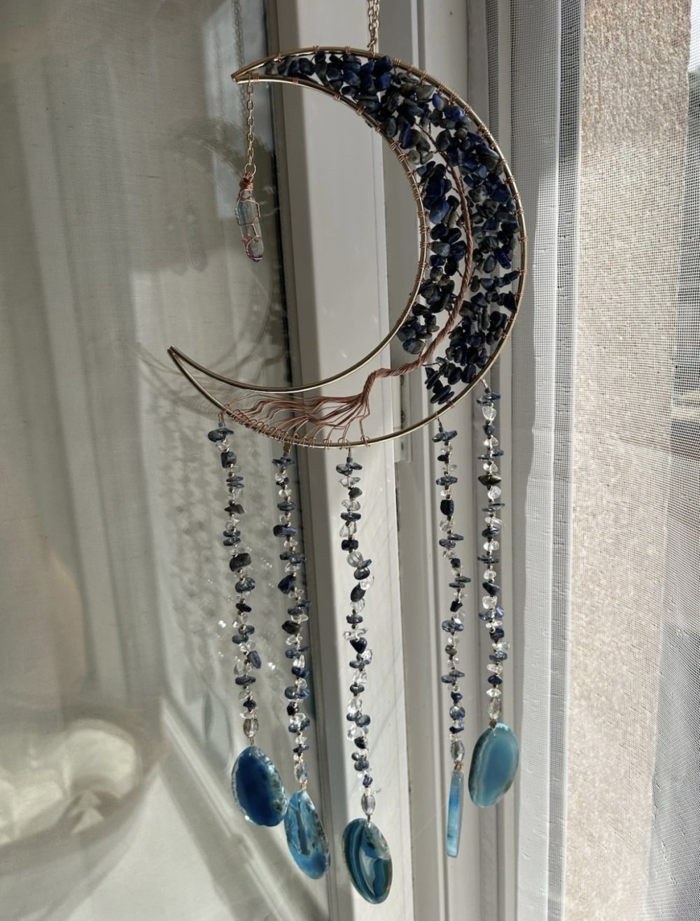 Ce sublime attrape-soleil en forme de lune croissante est orné de lapis lazuli, pierre ancestrale de sagesse et de vision intérieure. Les reflets dorés de la pyrite naturellement présente dans le lapis dialoguent harmonieusement avec les tranches d’agate bleue suspendues, créant une pièce à la fois mystique et lumineuse.