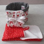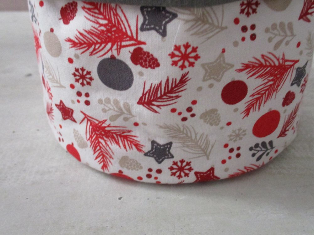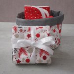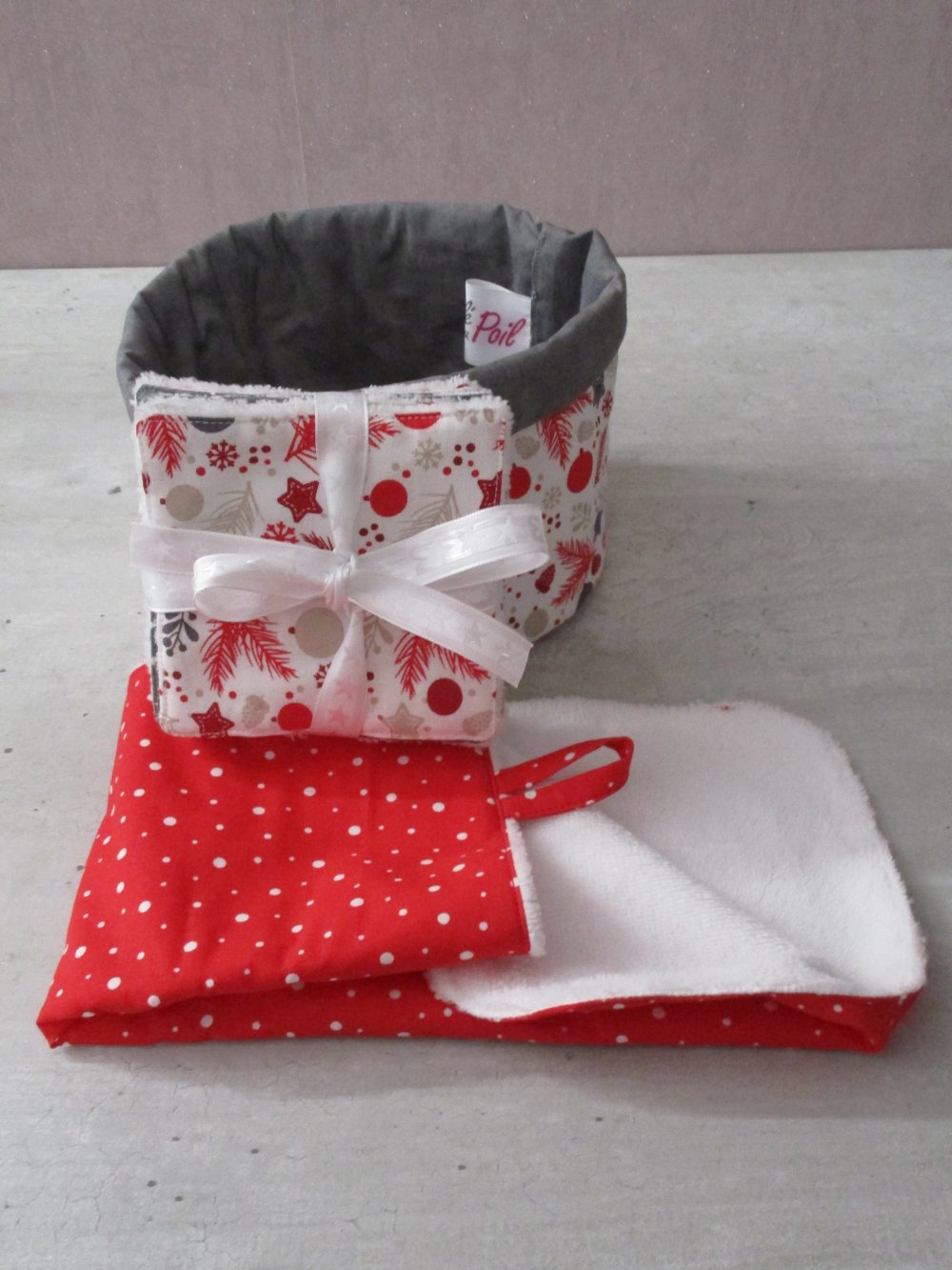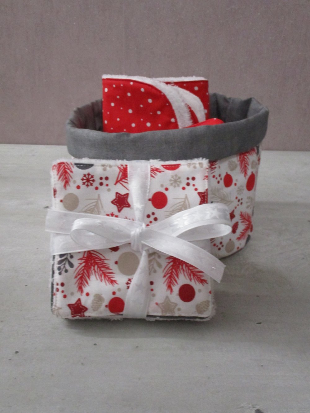 Petit panier aux couleurs de Noël fait main. Tout rond, souple contenant 8 lingettes, une petite serviette (41cm x 29 cm) pour les petites pattounes de vos compagnons ou la petite frimousse de vos enfants, en coton de bambou, motif Noël rouge et gris. . A offrir ou pour se faire plaisir: