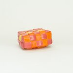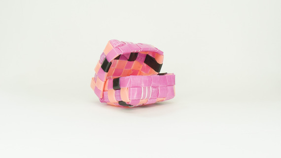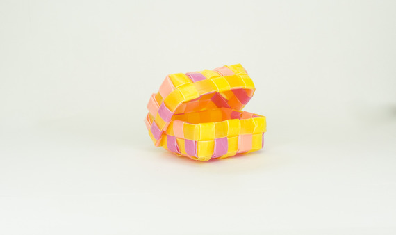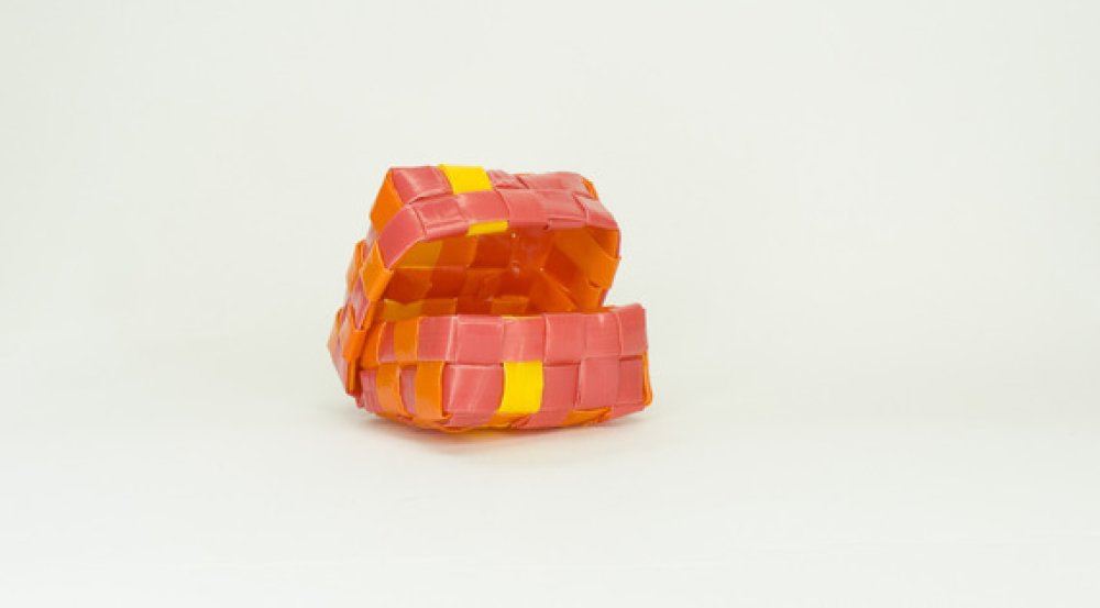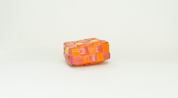 Tissage rose, orange, jaune ( (paille chalumeau plastifiée) ).