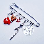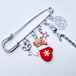 Broche, épingle à nourrice argentée, agrémentée de perles et breloques argentées et rouge de Noël.