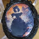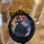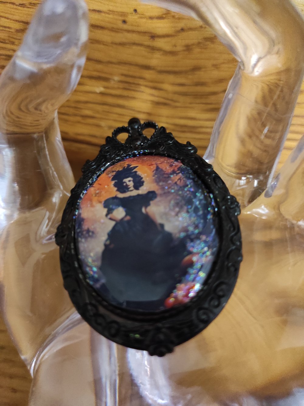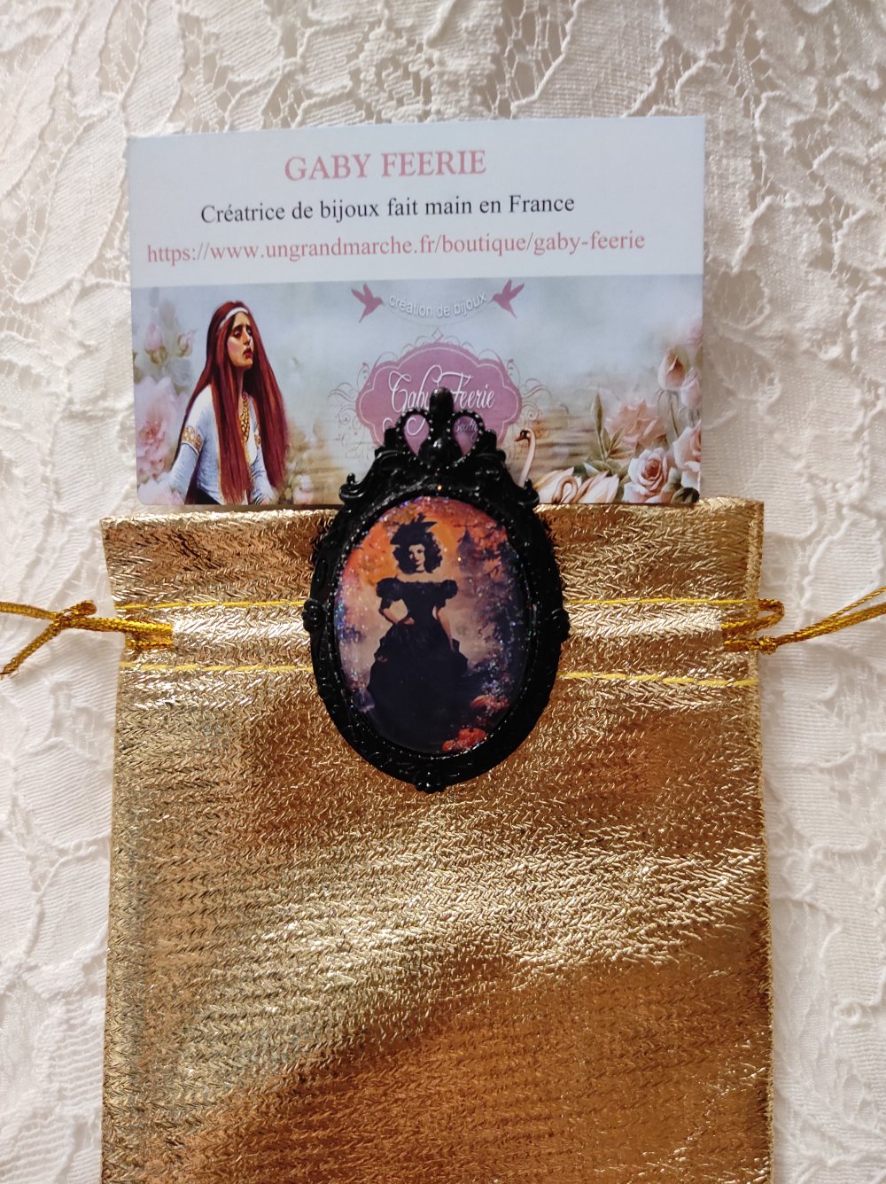 La broche est dans un cabochon noir qui mesure 6 cm de haut sur environ 4 cm de large. tandis que l'image sur papier photo 180 grammes mesure 30 x 40 mm.