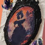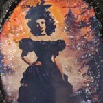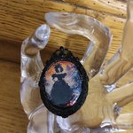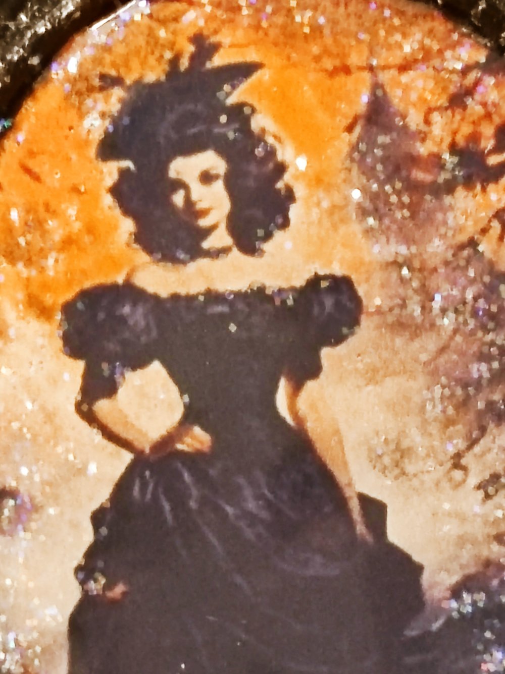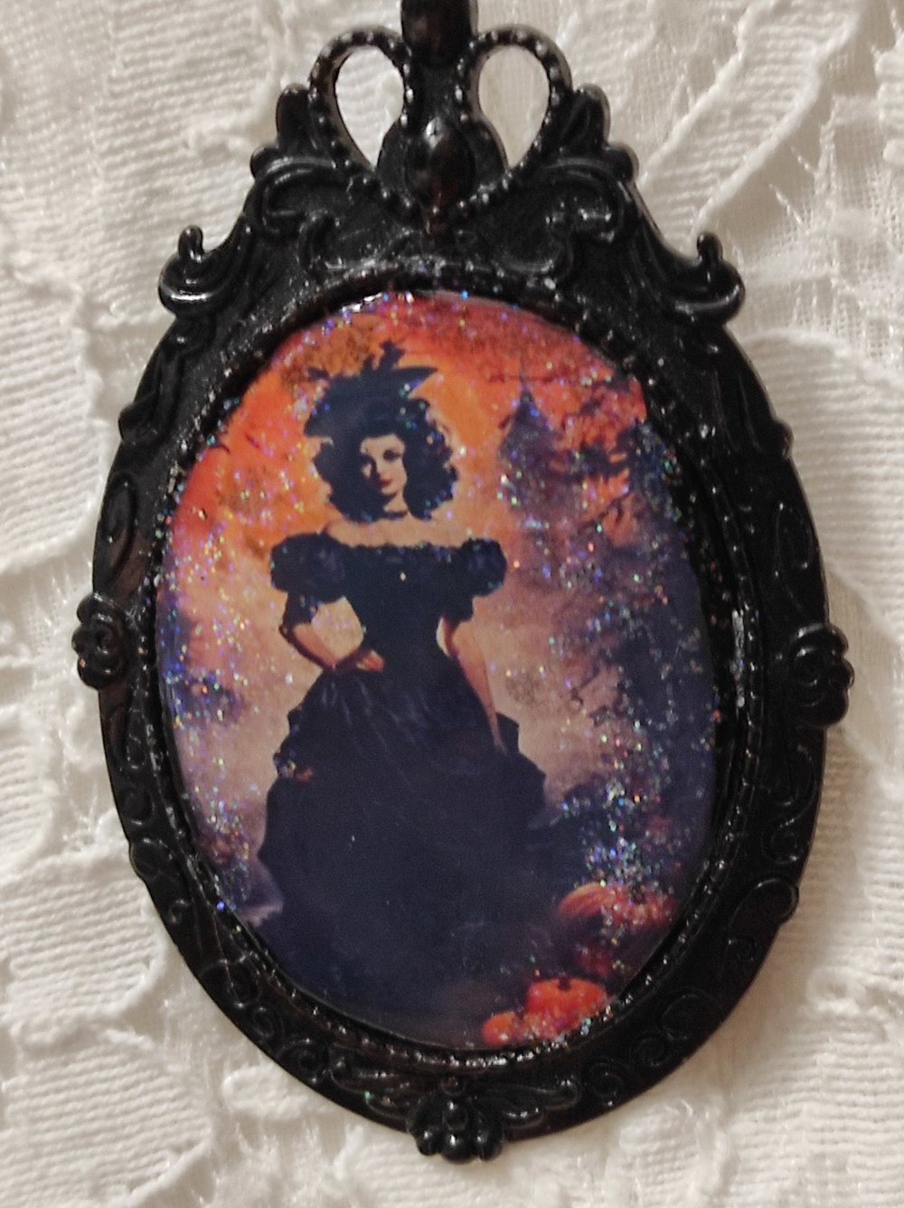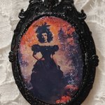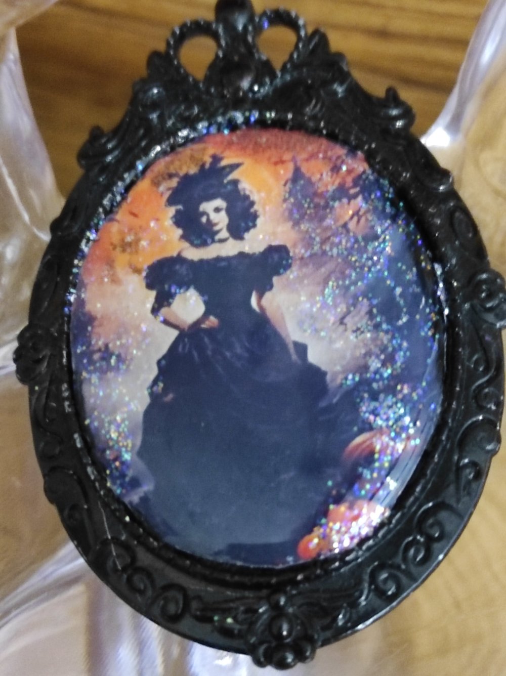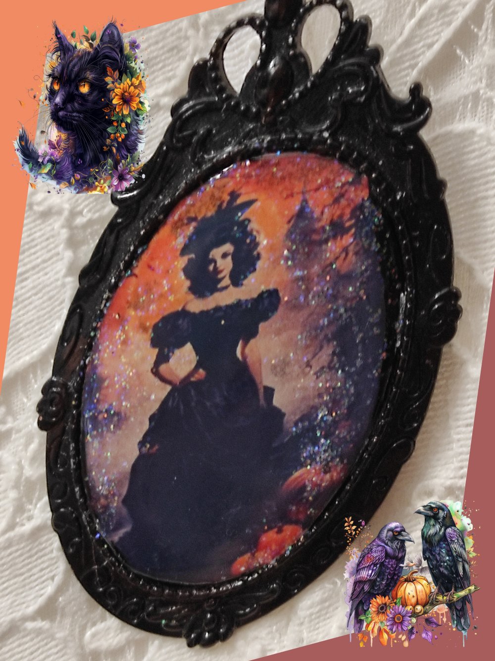Broche Marie Lacey et le dernier rituel celte des sorcières de Salem la nuit de Samhain pour rejoindre le manoir près d'elle en suivant la route éclairée par la pleine lune afin de rejoindre d'autres sorcières pour le rituel de passage entre deux mondes. La sorcière et la majorité du décor sont en noir ainsi que le chateau afin de faire ressortir les couleurs vives et chatoyantes du ciel orangé comme une nuit de feu et des citrouilles du chemin repeint avec mes paillettes spéciales bijoux.