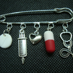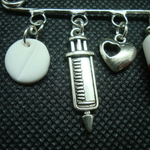 Je vous propose cette amusante broche sur le thème médical avec 5 breloques : comprimé, seringue, coeur, gélule et stéthoscope.