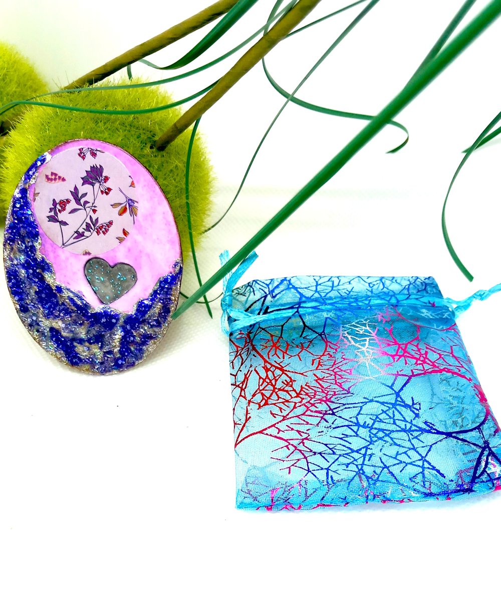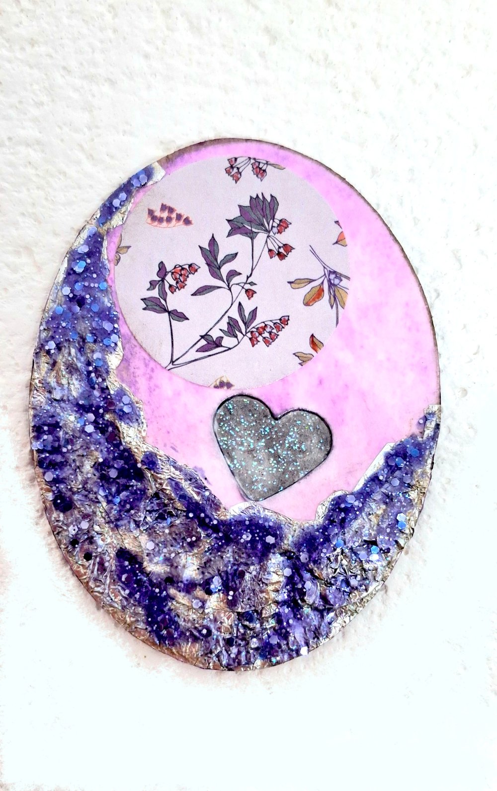 Broche artisanale en aluminium peint, de forme ovale, dans des tons violets éclatants, coeur en relief