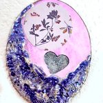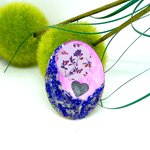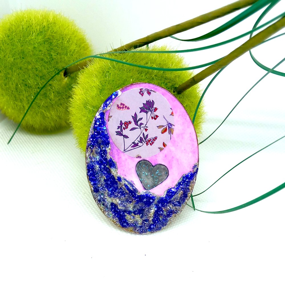 Broche ovale violette en alumium peint - Bijou moderne avec coeur en relief et petites fleurs - Cadeau broche moderne originale