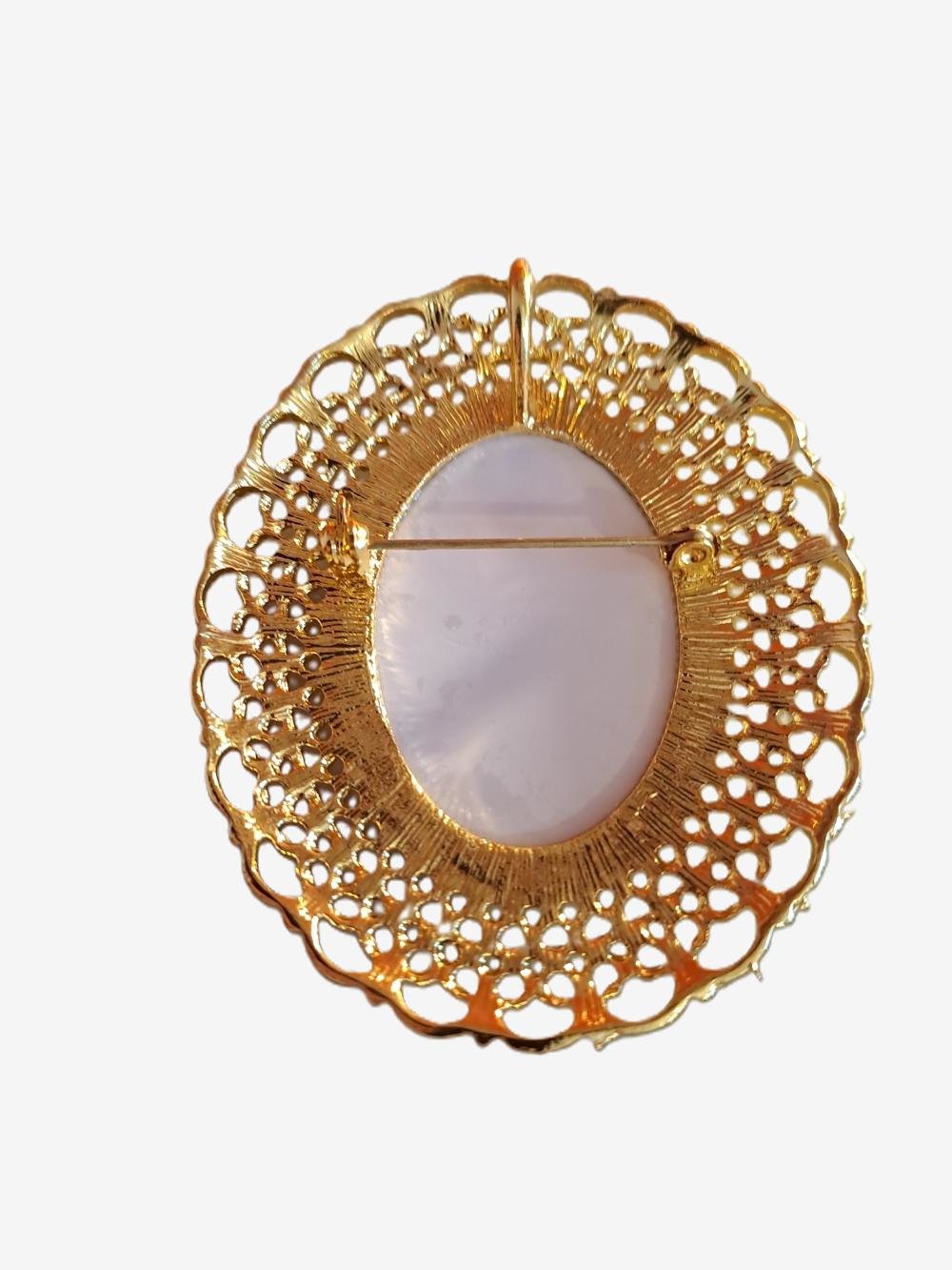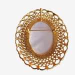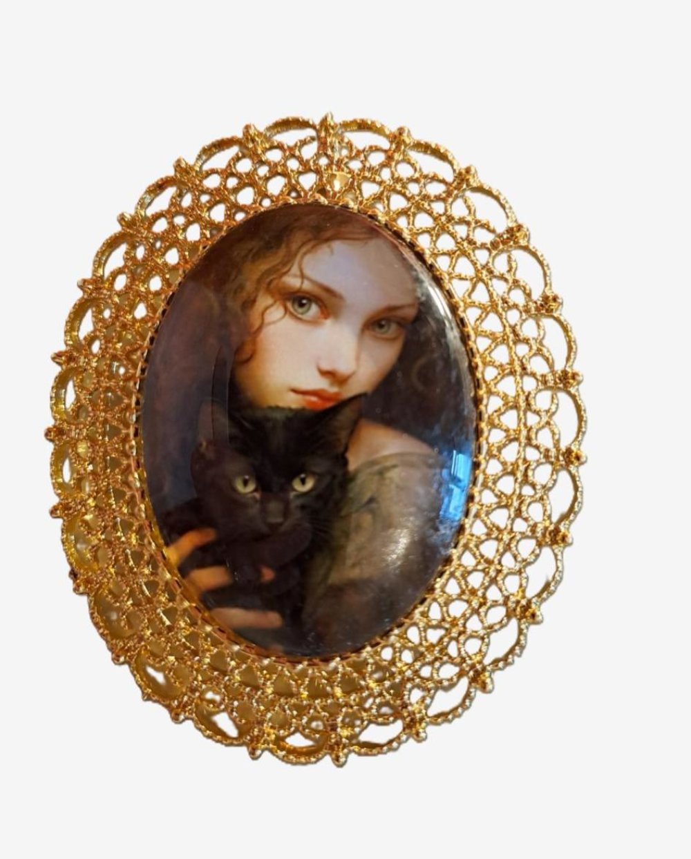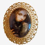 Broche ornée d'un cabochon représentant une jeune fille et son chat, montée sur un magnifique support doré dentelé