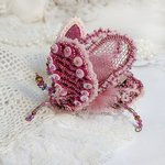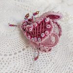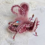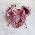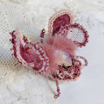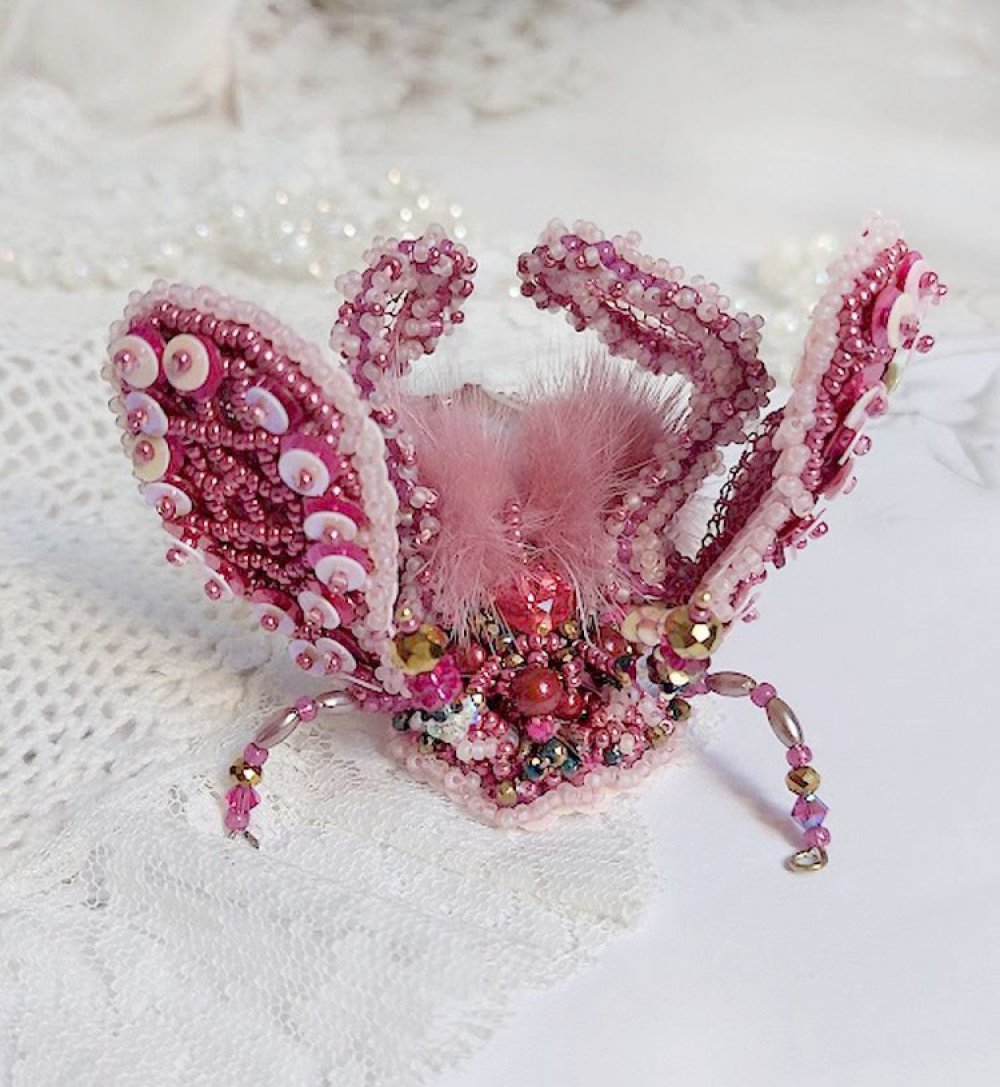 Broche Scarabée Peony Pink brodée avec des rocailles Miyuki et tchèques en verre à laquelle s’ajoute des perles rondes aplaties, sequins, dentelle très fine, perles Cristal Swarovski, pompon fourrure vison, suédine et broche laiton