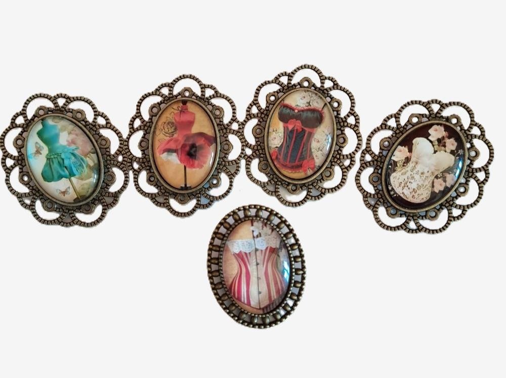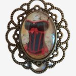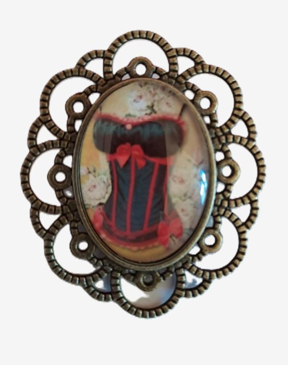 Très belle broche vintage ornée d'un cabochon représentant un corset rouge et noir