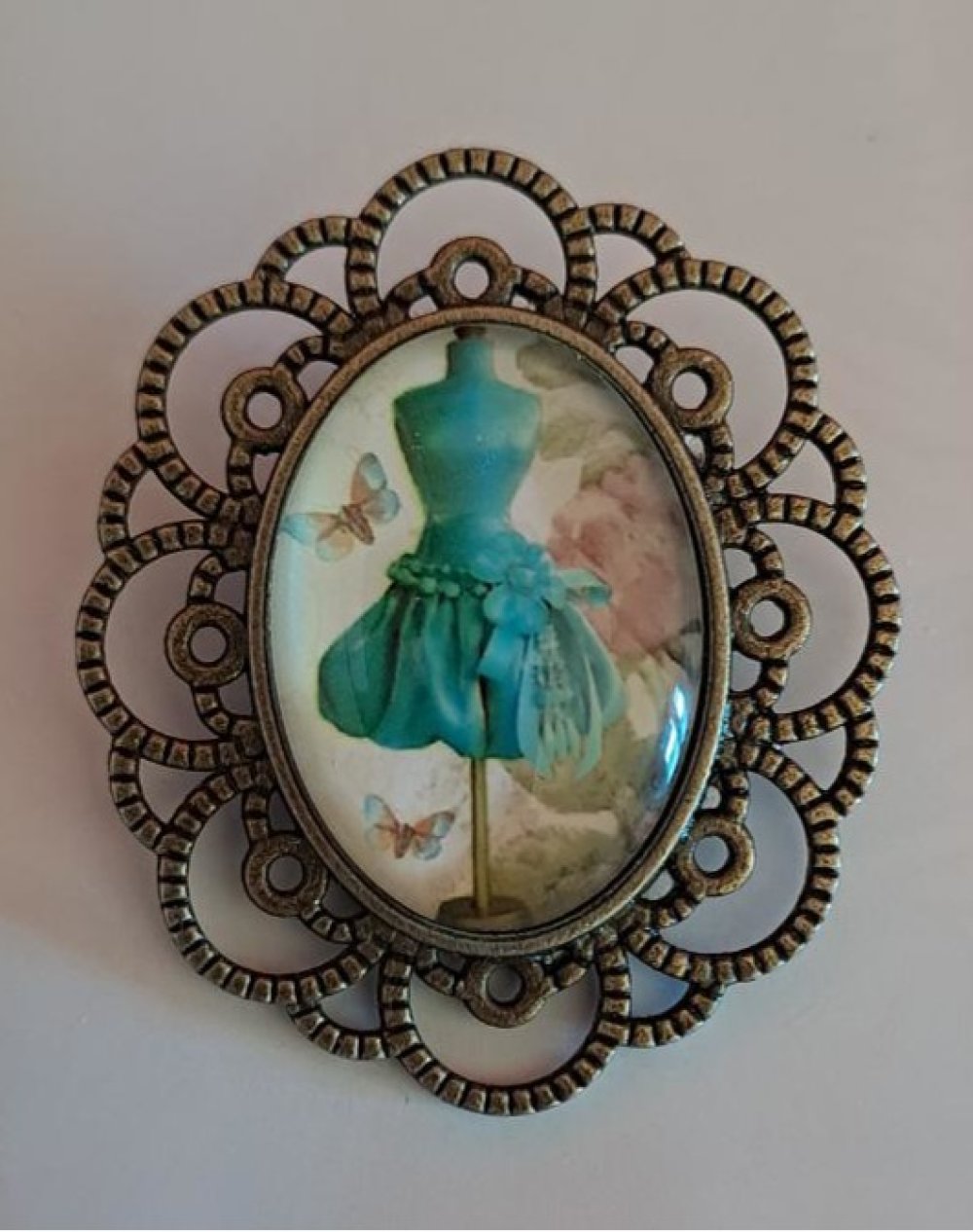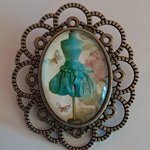 Très belle broche vintage ornée d'un cabochon représentant une robe turquoise sur un mannequin