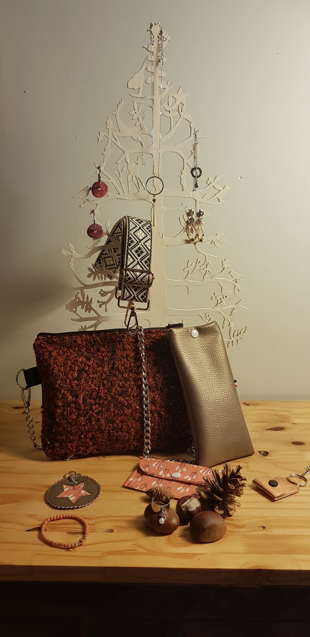 Je vous propose des bijoux ainsi que des articles de maroquinerie, accessoires cheveux... réalisés à partir de mes propres idées et patrons, dans mon petit atelier de Bourgogne Franche-Comté.