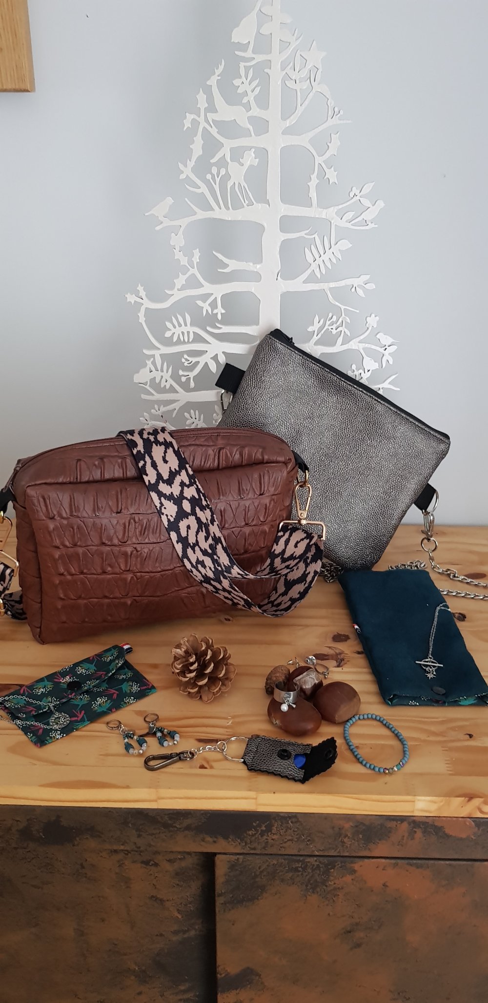 Je vous propose des bijoux ainsi que des articles de maroquinerie, accessoires cheveux... réalisés à partir de mes propres idées et patrons, dans mon petit atelier de Bourgogne Franche-Comté.