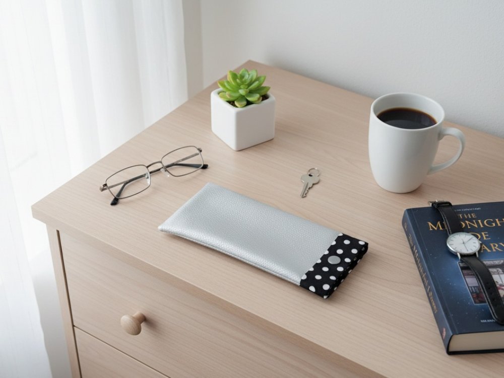 Etui à lunette en simili cuir gris argent et tissus à pois