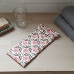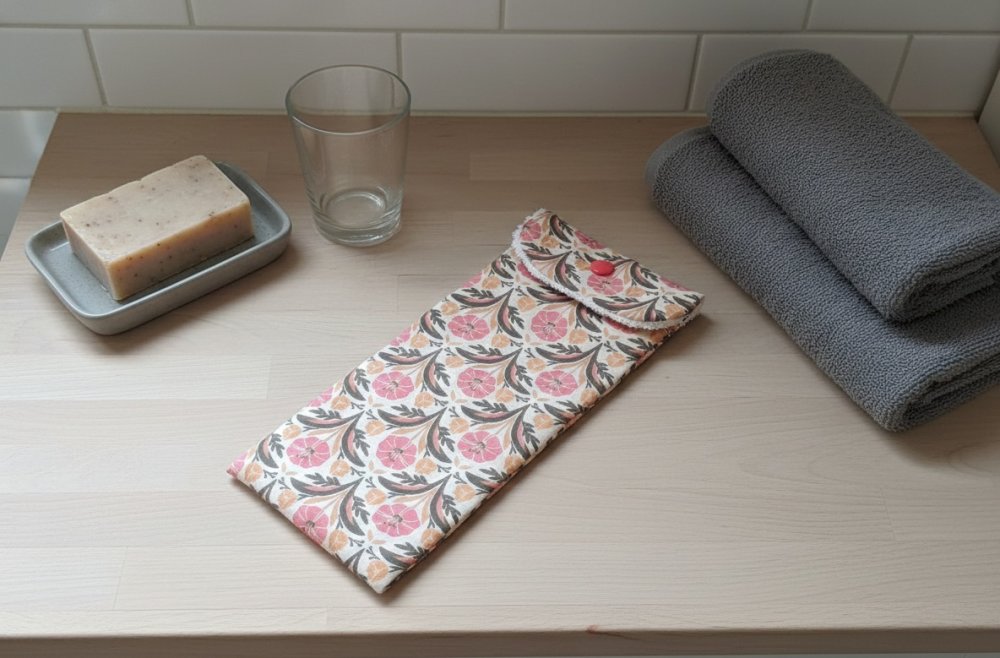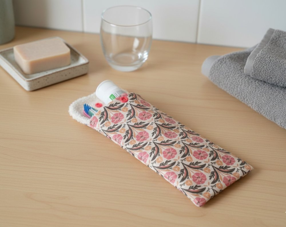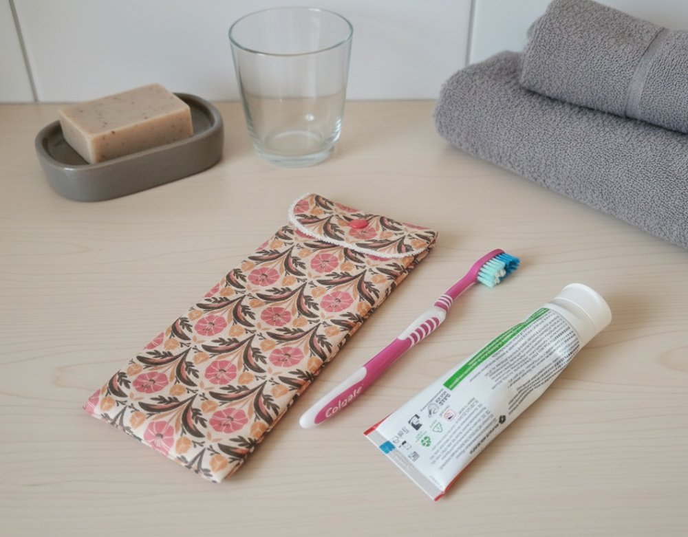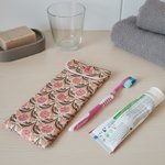 Emportez en voyage votre brosse à dents et votre dentifrice dans cet étui. L'intérieur est en tissu éponge de couleur beige et le tissu principal motifs fleurs certifié Oeko-Tex.