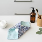 Intérieur coton nid d'abeille de couleur bleu ciel et extérieur coton certifié Oeko-Tex sur fond blanc et motifs feuilles mauves.
