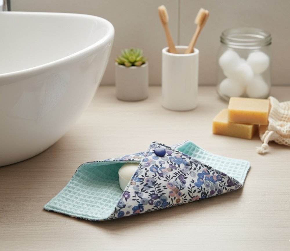 Très jolie pochette à savon ou shampoing solide qui se ferme à l’aide d’un bouton pression.