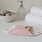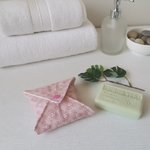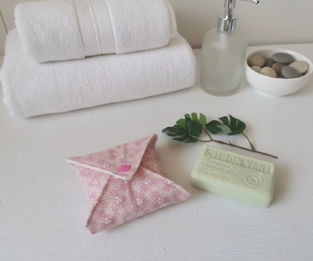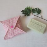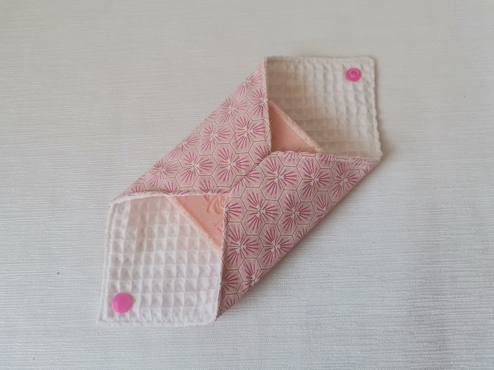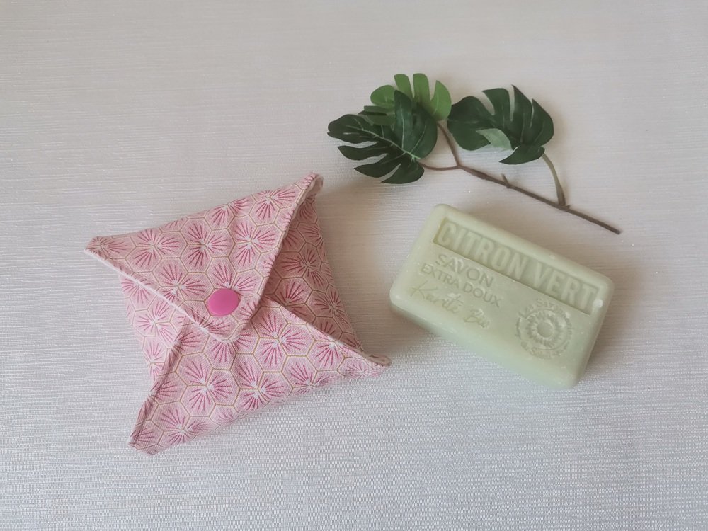Très jolie pochette à savon ou shampoing solide qui se ferme à l’aide d’un bouton pression.